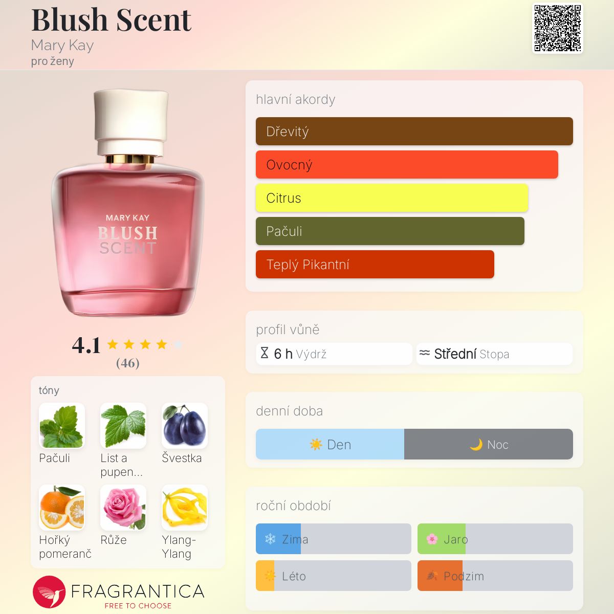 Blush Scent podle Mary Kay je Floral Fruity vůně pro ženy. Blush Scent byl/a uveden/a v roce 2021. Vrchní tóny jsou Černý rybíz, Hořký pomeranč, Kalábrijský bergamot a Bergamot; střední tóny jsouŠvestka, Červená růže, Ylang-Ylang, Bulharská růže, Gardénie, Červené jablko a Lesní jahoda ; základní tóny jsou List indonéského pačuli, Madagaskarská vanilka, Benzoin, Santalové dřevo a Pižmo.