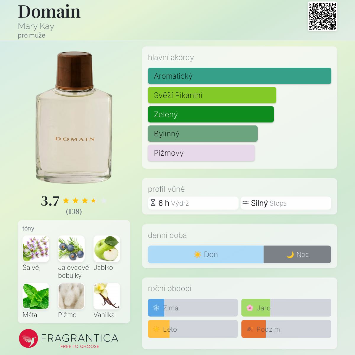 Domain podle Mary Kay je Aromatic vůně pro muže. Domain byl/a uveden/a v roce 2000. "Nosem" za touto vůní je Thierry Wasser. Vrchní tóny jsou Šalvěj a Zelené jablko; střední tóny jsouJalovcové bobulky a Máta ; základní tóny jsou Pižmo a Černý vanilkový lusk.