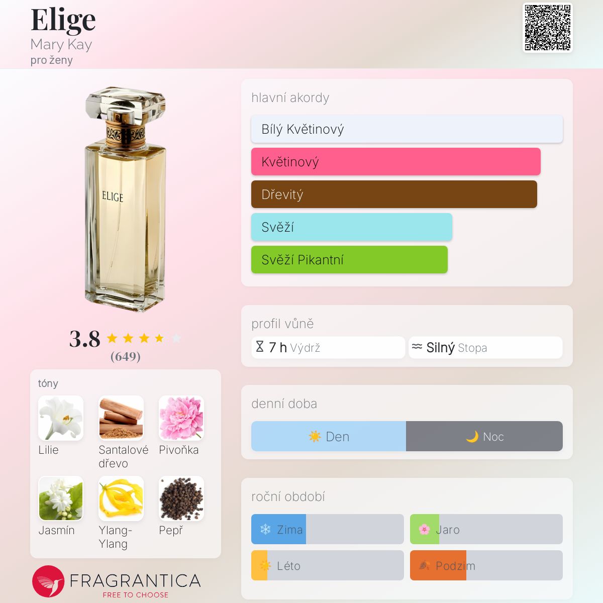 Elige podle Mary Kay je Floral vůně pro ženy. Elige byl/a uveden/a v roce 1998. "Nosem" za touto vůní je Etienne Bouckaert. Vrchní tóny jsou Lilie, Pivoňka, Frézie a Brambořík; střední tóny jsouJasmín, Ylang-Ylang, Tuberóza, Měsíček a Mandarinka ; základní tóny jsou Santalové dřevo, Bílý pepř, Pačuli, Mahagon a Kořen kosatce.