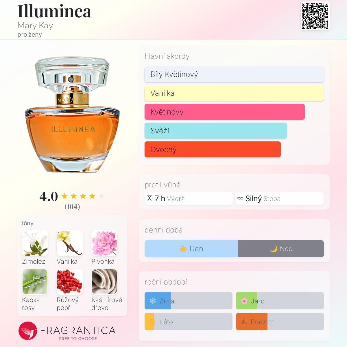 Illuminea podle Mary Kay je vůně pro ženy. Illuminea byl/a uveden/a v roce 2020. "Nosem" za touto vůní je Gino Percontino. Vrchní tóny jsou Kapka rosy, Růžový pepř a Mandarinka; střední tóny jsouZimolez a Červená pivoňka ; základní tóny jsou Vanilka, Kašmírové dřevo a Dubový mech.