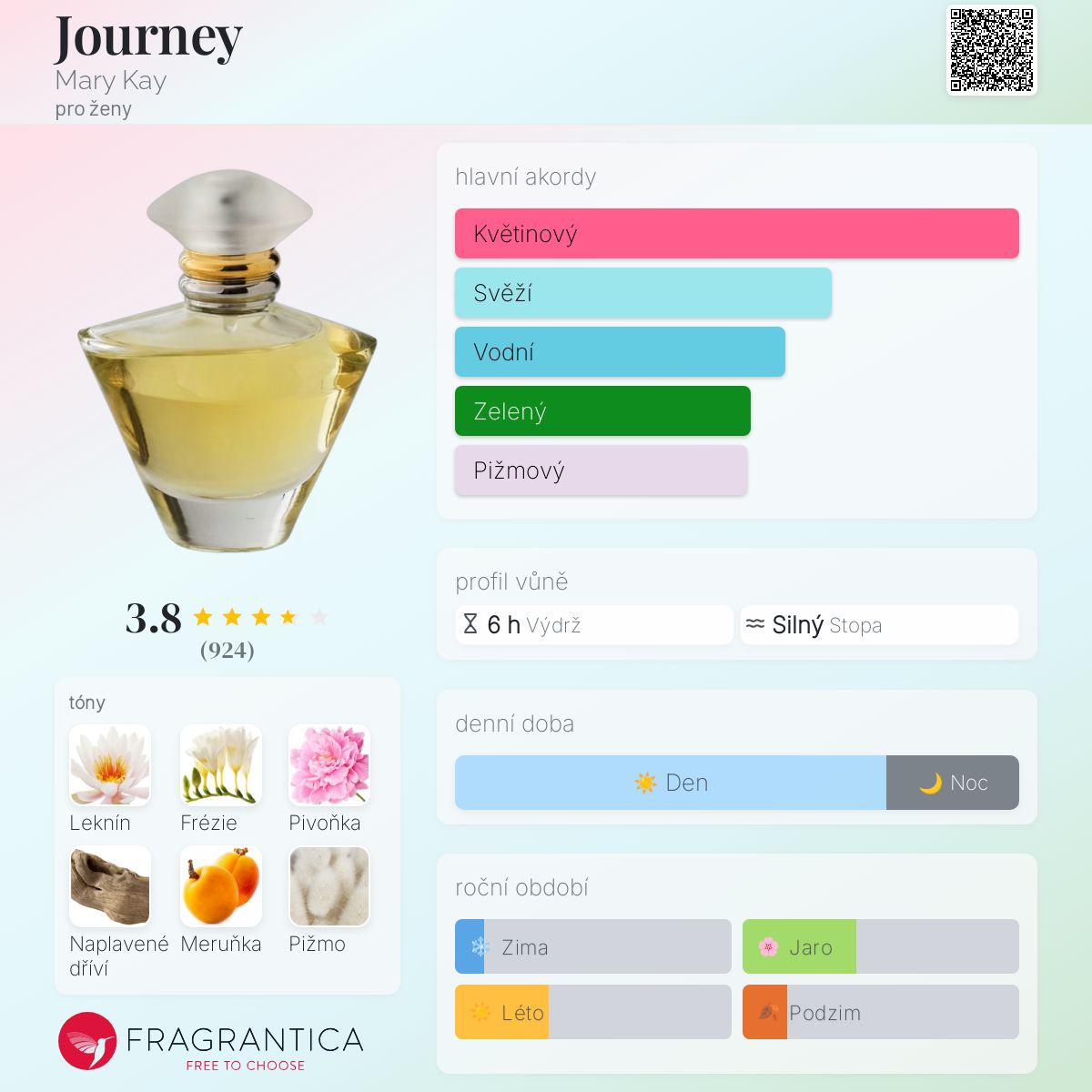 Journey podle Mary Kay je Floral vůně pro ženy. Journey byl/a uveden/a v roce 1997. Vrchní tóny jsou Leknín a Máta; střední tóny jsouFrézie a Pivoňka ; základní tóny jsou Naplavené dříví, Meruňka a Pižmo.