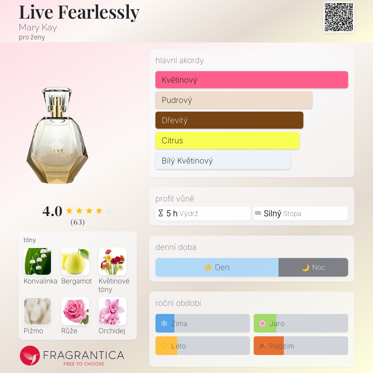 Live Fearlessly podle Mary Kay je Floral Woody Musk vůně pro ženy. Live Fearlessly byl/a uveden/a v roce 2017. "Nosem" za touto vůní je Linda Song. Vrchní tóny jsou Bergamot, Okvětní lístky a Zázvor; střední tóny jsouKonvalinka, Růže a Orchidej ; základní tóny jsou Pižmo, Australské santalové dřevo, Vanilka, Cedr a Fazole tonka.