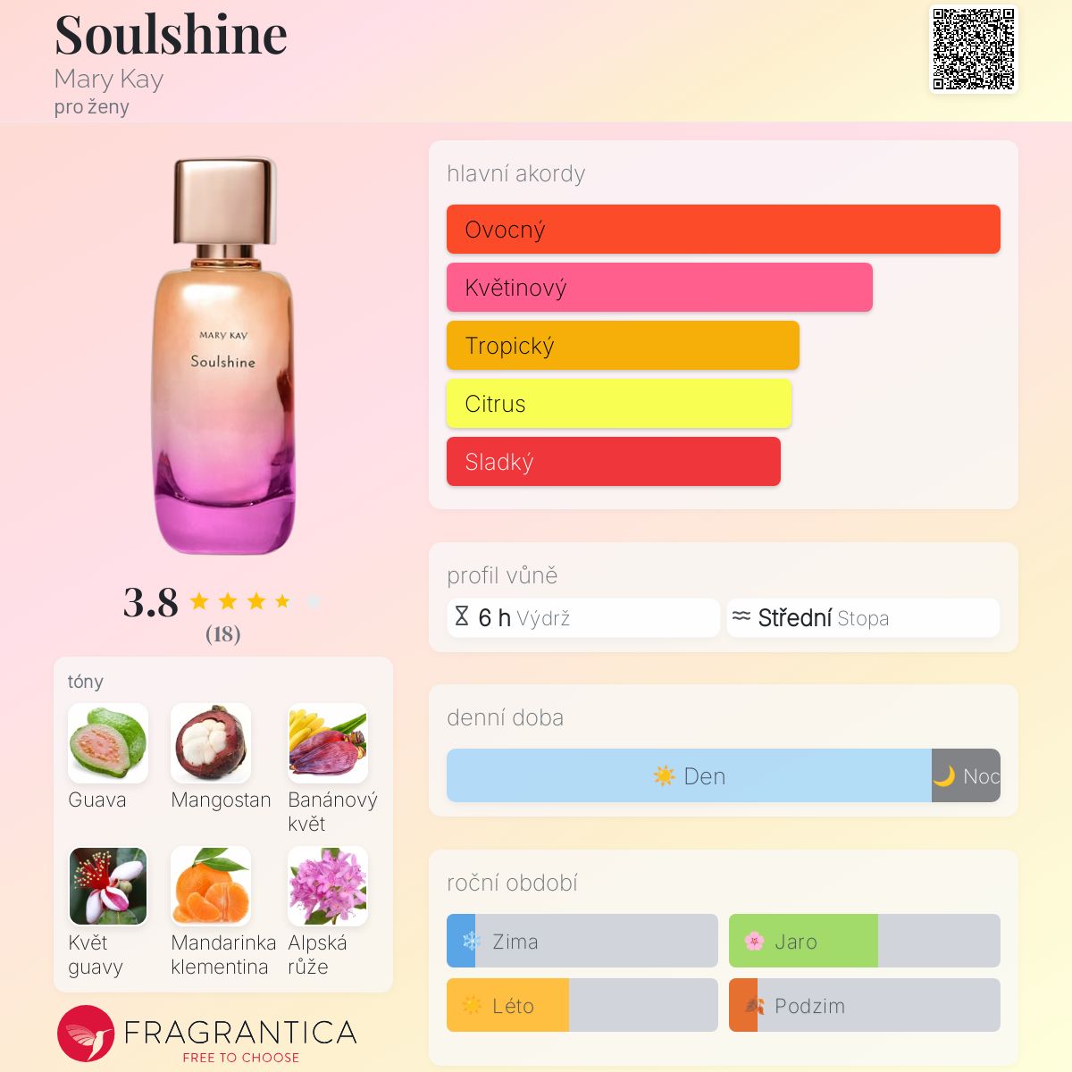 Soulshine podle Mary Kay je vůně pro ženy. Soulshine byl/a uveden/a v roce 2021. Soulshine byl/a vytvořen/a Givaudan a Rodrigo Flores-Roux. Vrchní tóny jsou Guava, Mangostan, Banánový květ, Mandarinka klementina a Bergamot; střední tóny jsouKvět guavy, Alpská růže, Magnólie, Ostružina a Maliny ; základní tóny jsou Černý rybíz a Dřevité tóny.