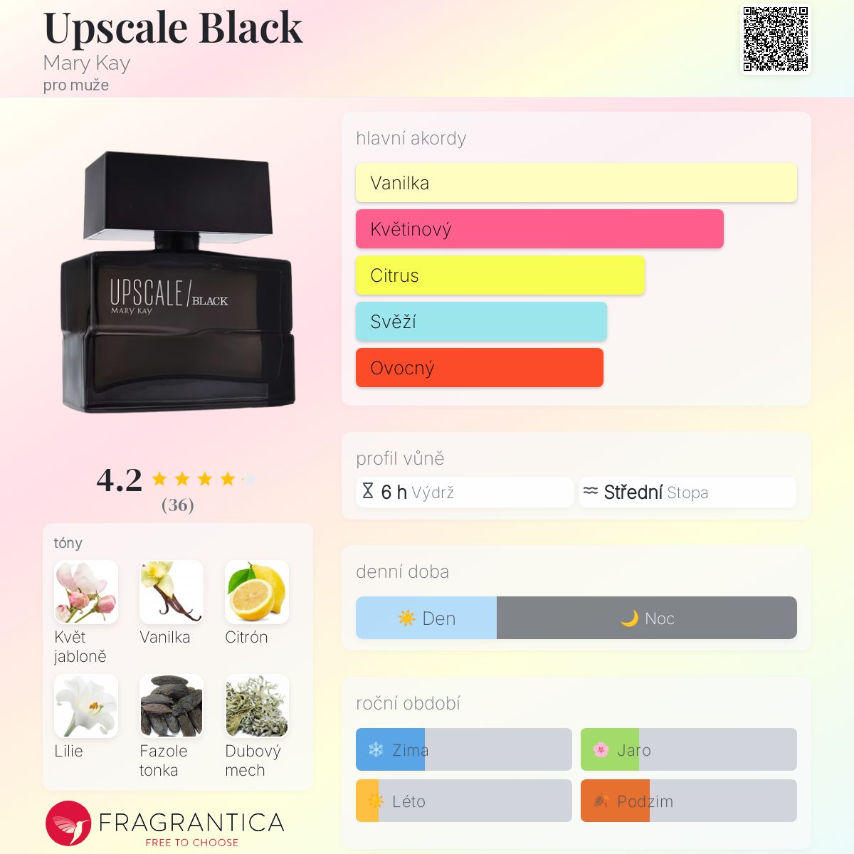Upscale Black podle Mary Kay je vůně pro muže. Upscale Black byl/a uveden/a v roce 2014. Vrchní tóny jsou Květ jabloně , Italský citrón a Bílý grapefruit; střední tóny jsouLilie, Fazole tonka a Levandule ; základní tóny jsou Mexická vanilka, Dubový mech, Javanol a Jantar (ambra).