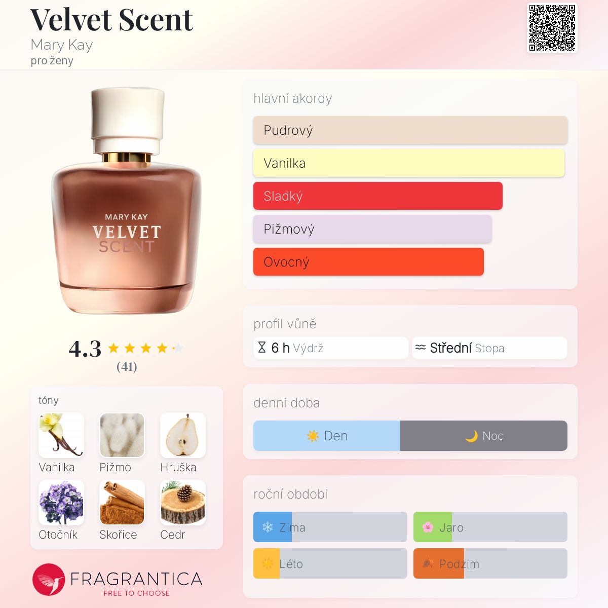 Velvet Scent podle Mary Kay je Orientální Floral vůně pro ženy. Velvet Scent byl/a uveden/a v roce 2021. Vrchní tóny jsou Hruška, Bergamot a Mandarinka; střední tóny jsouSkořice, Damašská růže, Jasmín, Konvalinka a Švestka ; základní tóny jsou Madagaskarská vanilka, Pižmo, Kašmírové pižmo, Otočník, Cedr, Karamel a Jantar (ambra).