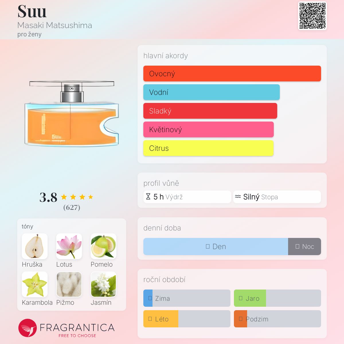 Suu podle Masaki Matsushima je Orientální Floral vůně pro ženy. Suu byl/a uveden/a v roce 2008. Vrchní tóny jsou Hruška, Pomelo a Karambola; střední tóny jsouLotus a Jasmín ; základní tóny jsou Pižmo a Cedr.