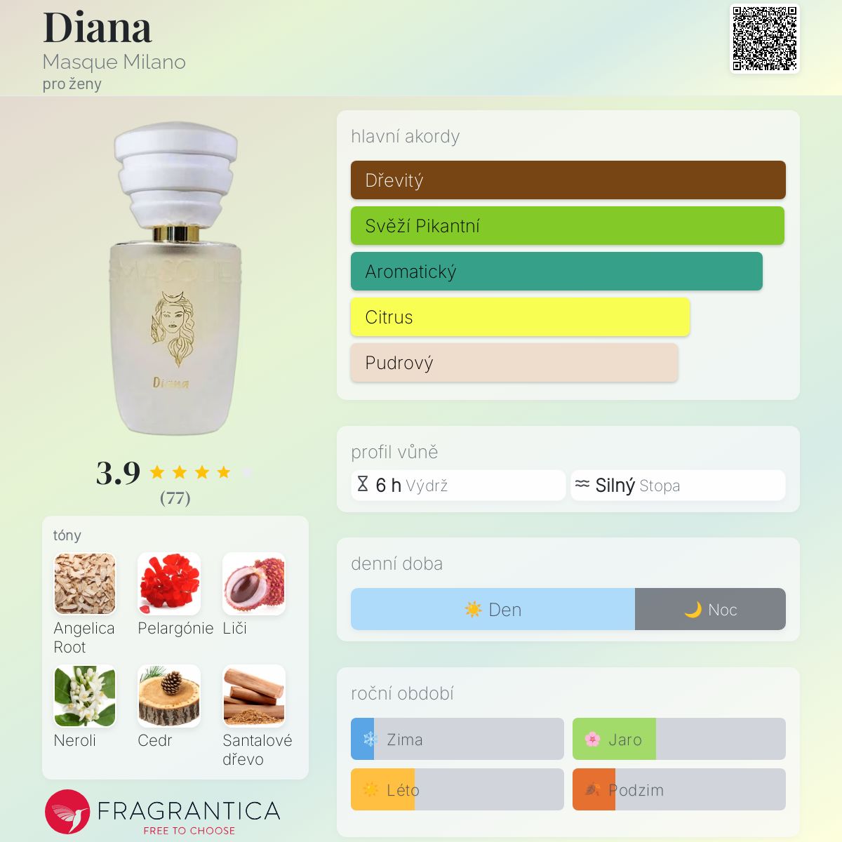Diana podle Masque Milano je Woody Aromatic vůně pro ženy. Toto je nová vůně. Diana byl/a uveden/a v roce 2024. "Nosem" za touto vůní je Vanina Muracciole. Vrchní tóny jsou Kořen anděliky, Liči a Bergamot; střední tóny jsouPelargónie, Tuniské neroli a Levandule ; základní tóny jsou Virginský cedr, Australské santalové dřevo a Bílé pižmo.