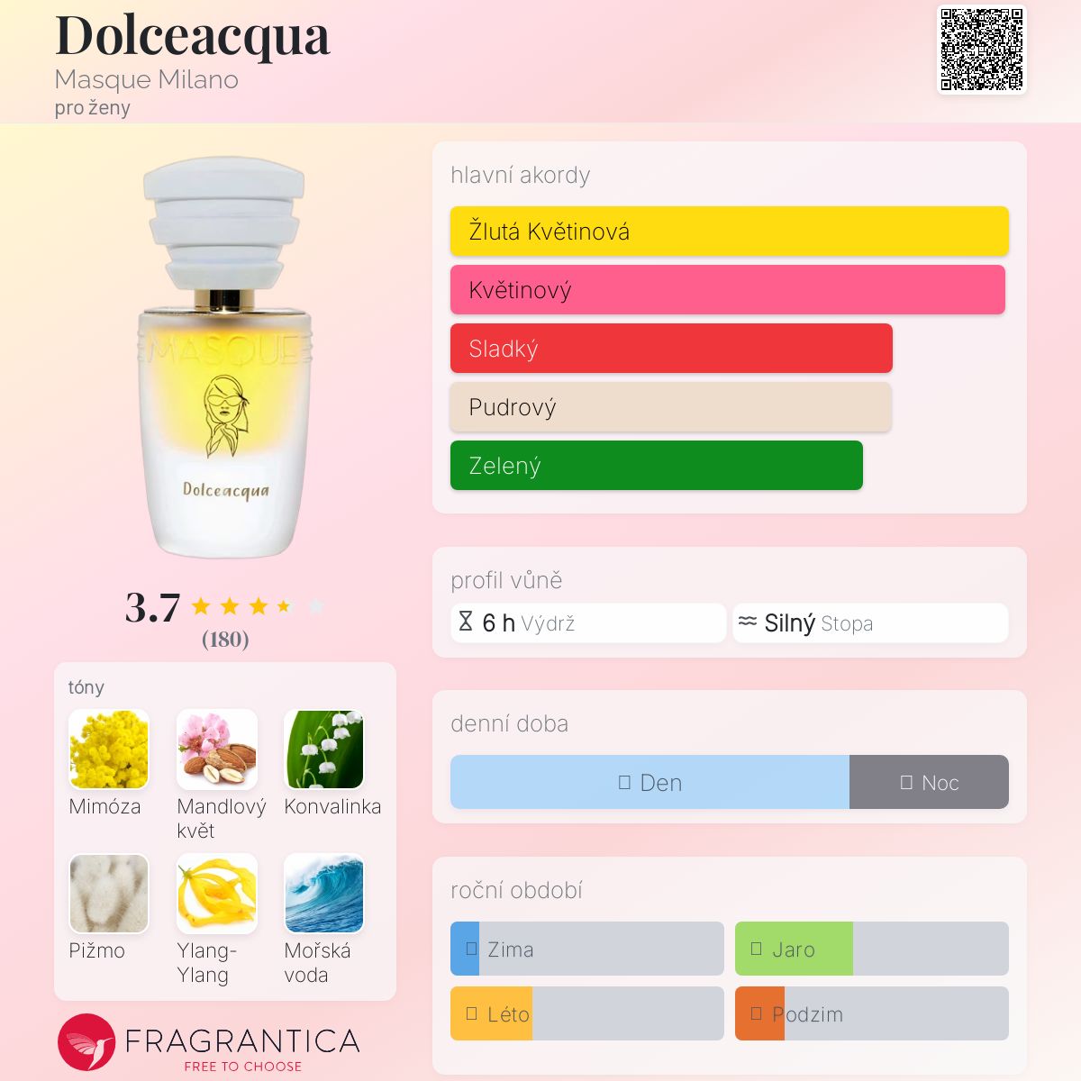 Dolceacqua podle Masque Milano je Woody Floral Musk vůně pro ženy. Dolceacqua byl/a uveden/a v roce 2020. "Nosem" za touto vůní je Delphine Thierry. Vrchní tóny jsou Konvalinka, Mořské tóny, Břečťan a Majoránka; střední tóny jsouMimóza, Mandlový květ , Ylang-Ylang a Bílá růže ; základní tóny jsou Pižmo, Dubový mech, Siamský (thajský) benzoin, Virginský cedr a Indický šafrán.