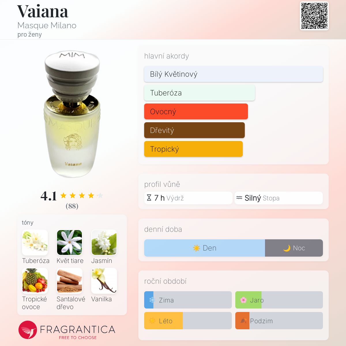 Vaiana podle Masque Milano je Floral Woody Musk vůně pro ženy. Toto je nová vůně. Vaiana byl/a uveden/a v roce 2024. "Nosem" za touto vůní je Mackenzie Reilly. Vrchní tóny jsou Tropické ovoce, Tuniské neroli a Bergamot; střední tóny jsouIndická tuberóza, Květ tiare a Jasmín Sambac ; základní tóny jsou Santalové dřevo, Vanilka a Solární tóny.