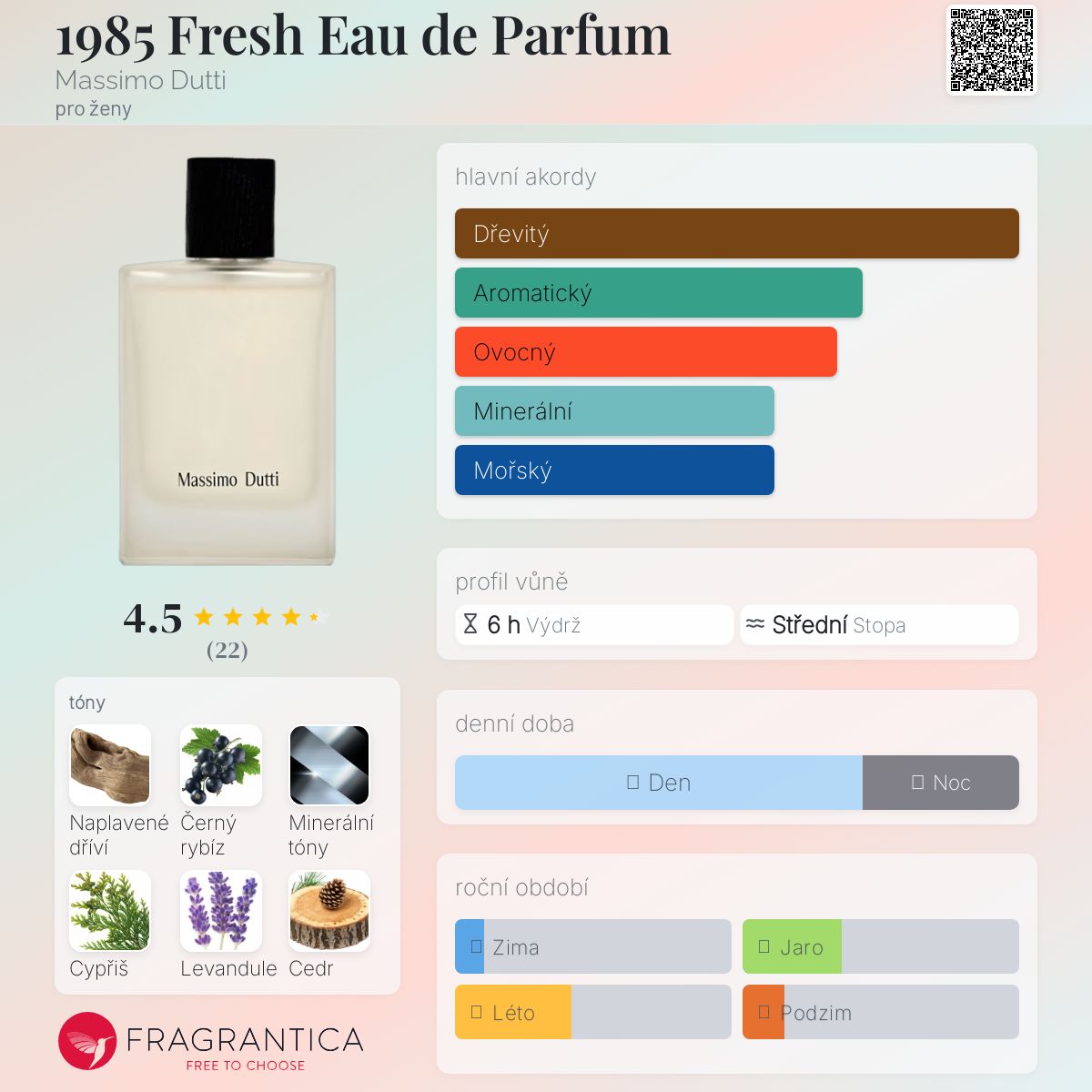 1985 Fresh Eau de Parfum podle Massimo Dutti je Woody Aromatic vůně pro ženy. Toto je nová vůně. 1985 Fresh Eau de Parfum byl/a uveden/a v roce 2024. "Nosem" za touto vůní je Ane Ayo. Vrchní tóny jsou Černý rybíz, Minerální tóny, Pelyněk a Citrón; střední tóny jsouCypřiš, Levandule, Šalvěj a Pepř ; základní tóny jsou Naplavené dříví, Cedr, Bílé pižmo, Vetiver a Jantar (ambra).