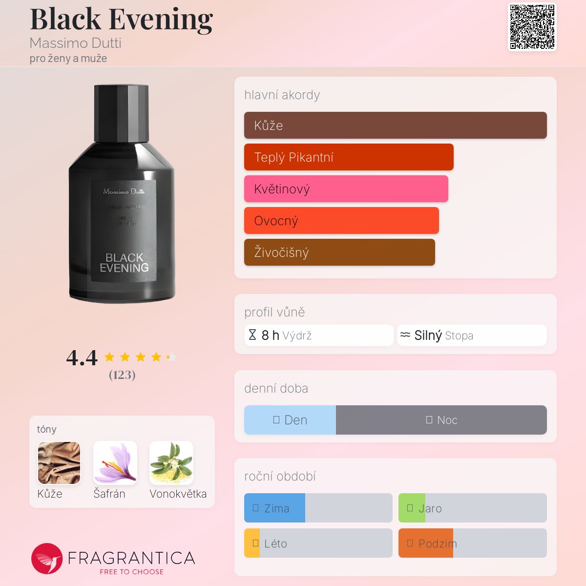 Black Evening podle Massimo Dutti je vůně pro ženy a muže. Black Evening byl/a uveden/a v roce 2021. "Nosem" za touto vůní je Givaudan. Vrchní tón je Vonokvětka ; střední tón jeŠafrán ; základní tón je Kůže.