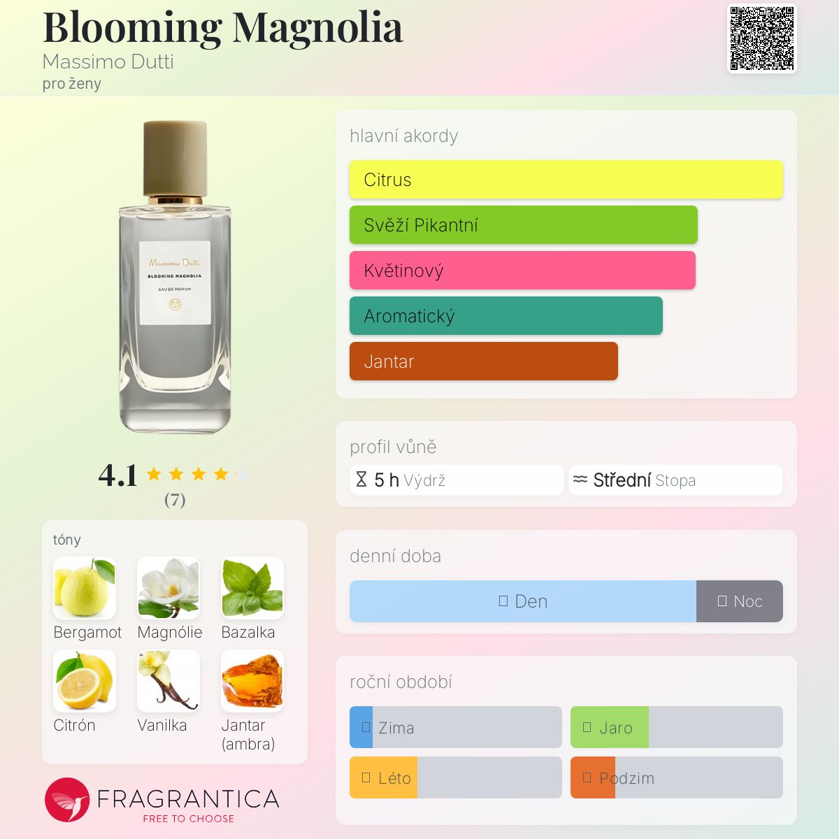 Blooming Magnolia podle Massimo Dutti je Citrus Aromatic vůně pro ženy. Blooming Magnolia byl/a uveden/a v roce 2020. "Nosem" za touto vůní je Ane Ayo. Vrchní tóny jsou Bergamot, Bazalka a Citron amalfi; střední tón jeMagnólie ; základní tóny jsou Vanilka, Jantar (ambra) a Myrha.