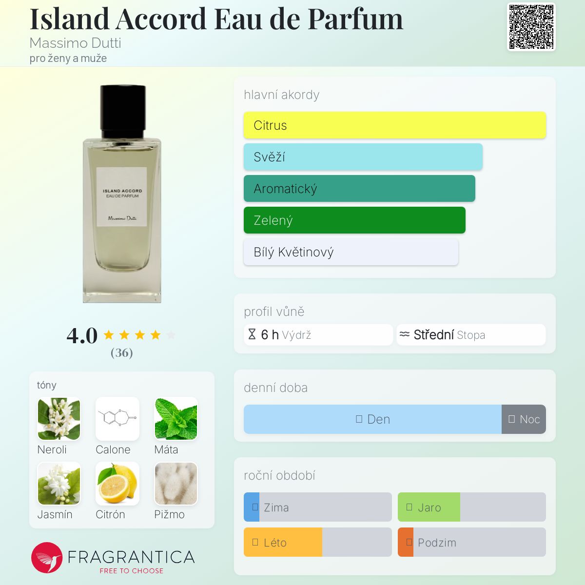 Island Accord Eau de Parfum podle Massimo Dutti je Citrus Aromatic vůně pro ženy a muže. Toto je nová vůně. Island Accord Eau de Parfum byl/a uveden/a v roce 2024. "Nosem" za touto vůní je Christophe Raynaud. Vrchní tóny jsou Máta, Citron amalfi , Krvavý pomeranč a Grapefruit; střední tóny jsouNeroli, Calone, Jasmín a Černý rybíz ; základní tóny jsou Pižmo, Dubový mech, Pačuli a Jantar (ambra).