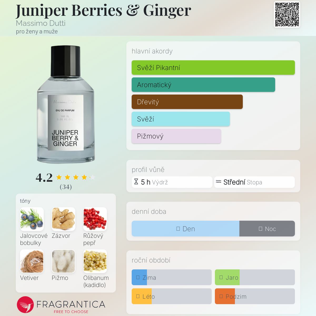 Juniper Berries & Ginger podle Massimo Dutti je vůně pro ženy a muže. Juniper Berries & Ginger byl/a uveden/a v roce 2021. "Nosem" za touto vůní je Ane Ayo. Vrchní tóny jsou Jalovcové bobulky, Růžový pepř a Aldehydy; střední tóny jsouNigerijský zázvor, Máta a Kosatec ; základní tóny jsou Vetiver, Pižmo a Olibanum.
