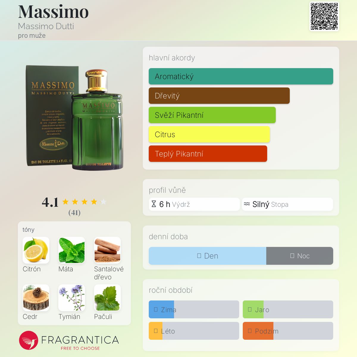 Massimo podle Massimo Dutti je Woody Aromatic vůně pro muže. Massimo byl/a uveden/a v roce 1992. "Nosem" za touto vůní je Ramon Monegal. Vrchní tóny jsou Citron amalfi , Máta, Tymián, Estragon, Levandule, Galbanum, Mandarinka a Bergamot; střední tóny jsouPelargónie, Kardamom, Jalovcové bobulky a Skořice ; základní tóny jsou Santalové dřevo, Virginský cedr, Pačuli a Pižmo.