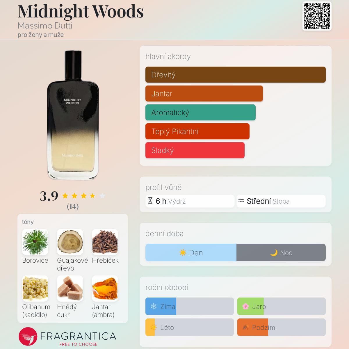 Midnight Woods podle Massimo Dutti je vůně pro ženy a muže. Toto je nová vůně. Midnight Woods byl/a uveden/a v roce 2024. "Nosem" za touto vůní je Leandro Petit. Vrchní tóny jsou Borovice, Hřebíček a Hnědý cukr; střední tóny jsouGuajakové dřevo, Jantar (ambra) a Kokos ; základní tóny jsou Olibanum, Vanilka a Kašmír.