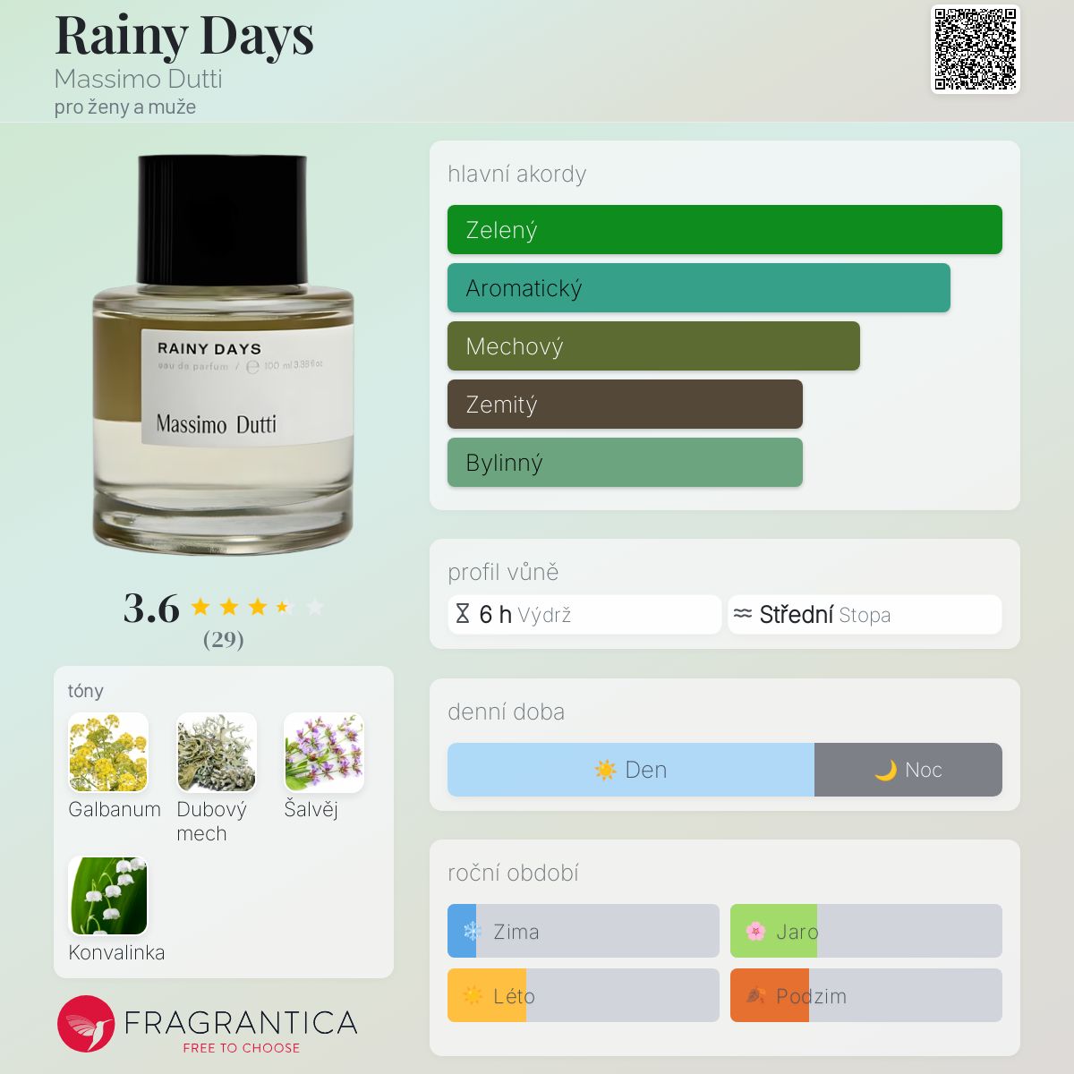 Rainy Days podle Massimo Dutti je Aromatic Green vůně pro ženy a muže. Toto je nová vůně. Rainy Days byl/a uveden/a v roce 2025. Vrchní tón je Šalvěj ; střední tóny jsouGalbanum a Konvalinka ; základní tón je Dubový mech.