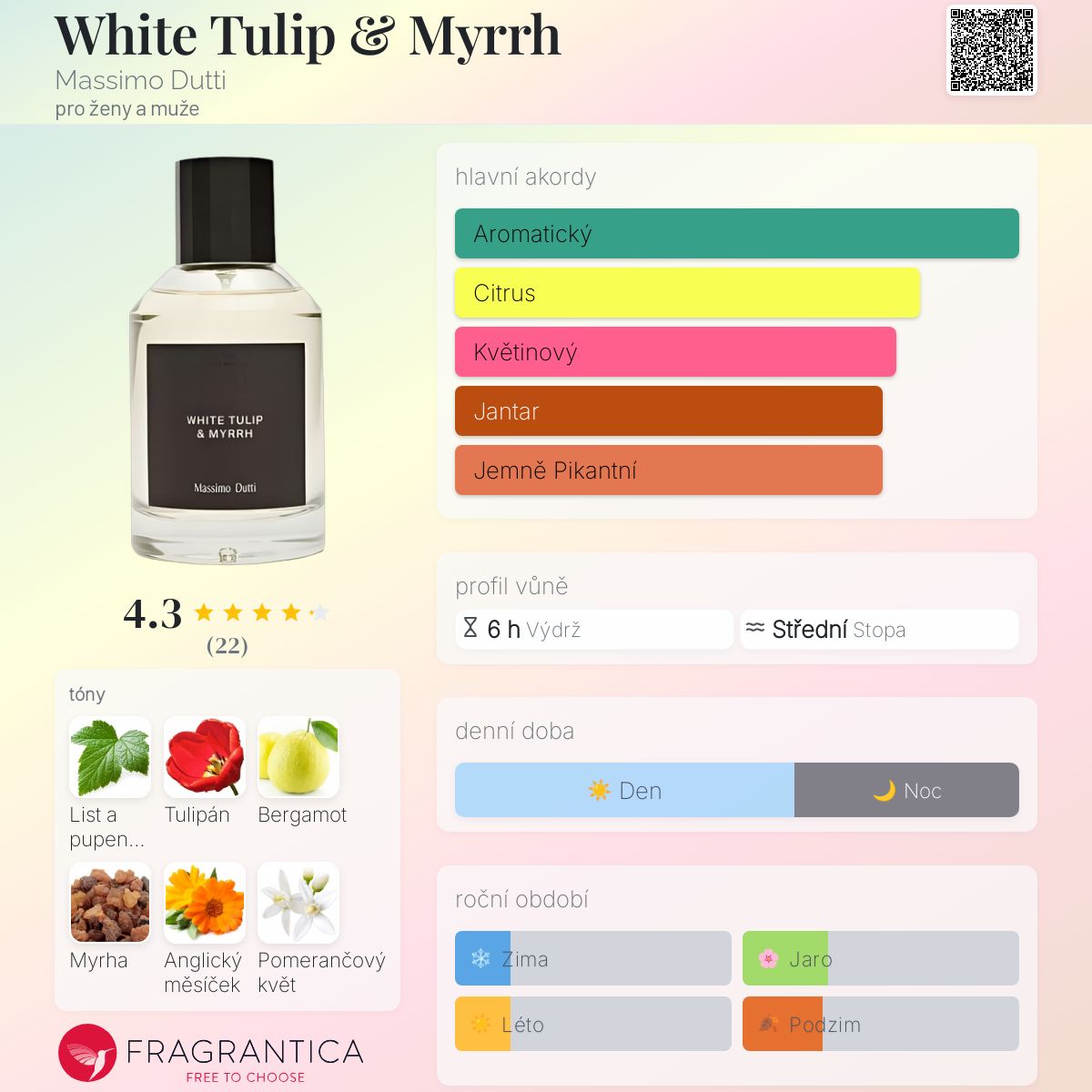 White Tulip & Myrrh podle Massimo Dutti je vůně pro ženy a muže. Toto je nová vůně. White Tulip & Myrrh byl/a uveden/a v roce 2024. "Nosem" za touto vůní je Alberto Morillas. Vrchní tóny jsou Černý rybíz, Bergamot a Měsíček; střední tóny jsouTulipán, Pomerančový květ a Brambořík ; základní tóny jsou Myrha, Cedr, Jantar (ambra) a Bílé pižmo.