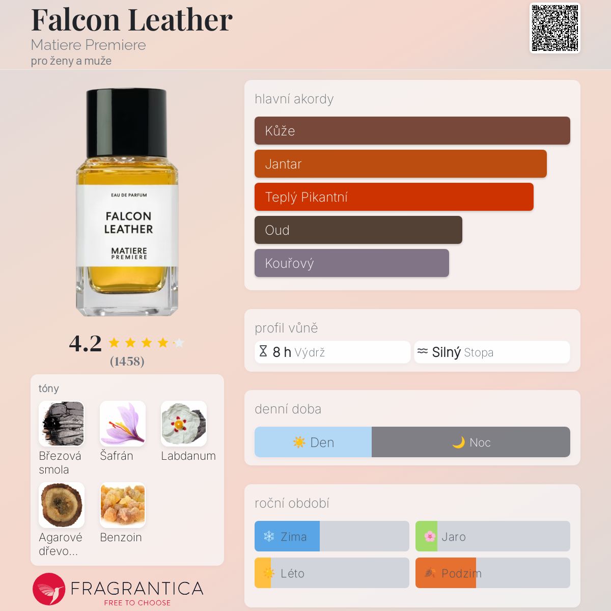 Jaká krásná vůně! Vzala jsem si ji na podzim, moc se mi líbila. Ale když jsem ji vyzkoušela v zimě, byla jsem opravdu nadšená. Není zde žádný březový dehet, i když jsem ho očekávala. Ze začátku je trochu jako Leder 6 J.F., ale bez té mléčné sladkosti. Pak je to taková normální kůže, jen vůbec ne kyselá. Později je trochu pudrová. No a otevírá se jen sametovou kůží, pokud něco takového vůbec existuje. Velmi útulná. Výdrž je vynikající - pracovní den, posilovna i sprcha jsou za mnou a tato Falcon Skin je stále se mnou.