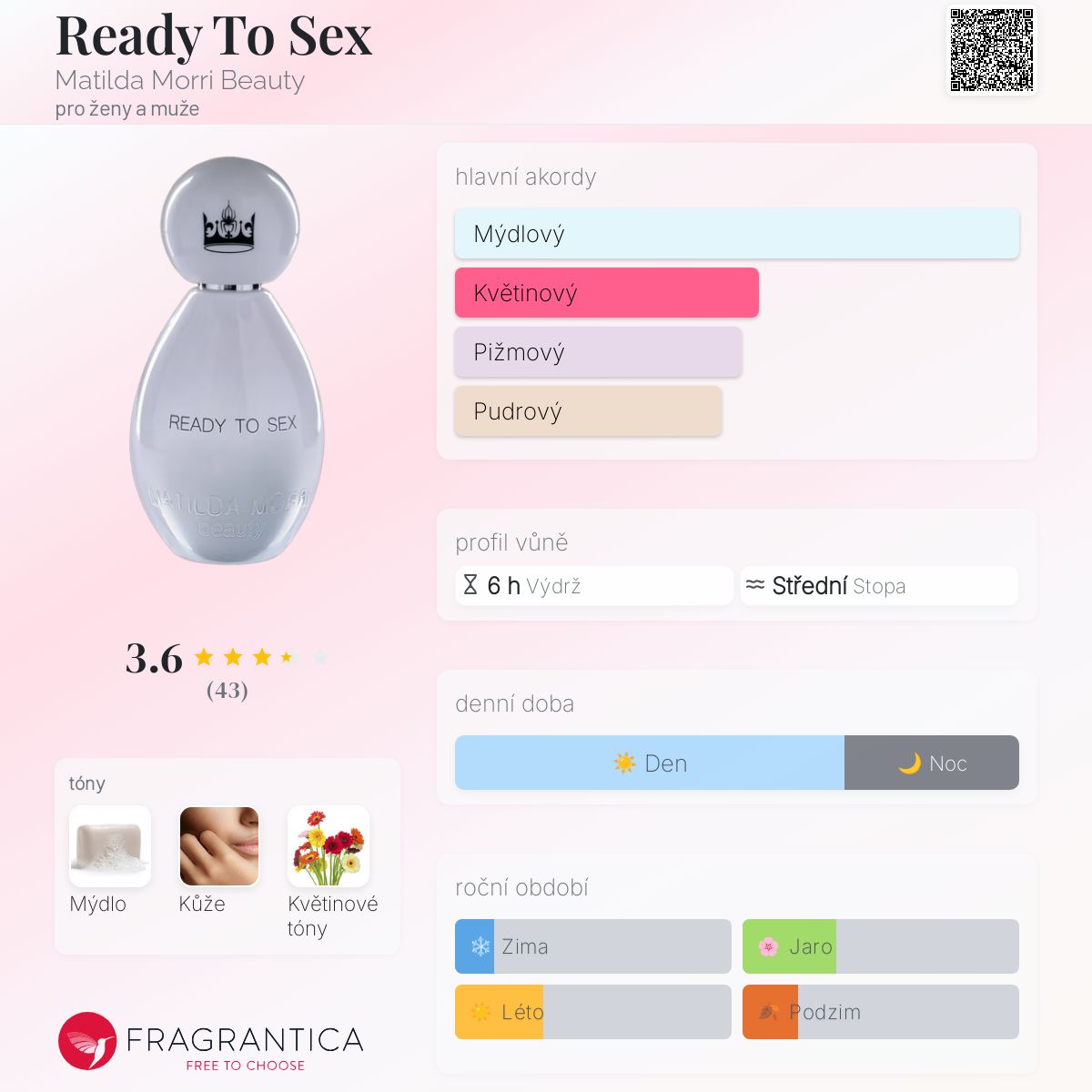 Ready To Sex podle Matilda Morri Beauty je Floral Aldehyde vůně pro ženy a muže. Toto je nová vůně. Ready To Sex byl/a uveden/a v roce 2024. "Nosem" za touto vůní je Rosa Vaia. Vrchní tón je Mýdlo ; střední tón jeKvětinové tóny ; základní tón je Kůže.