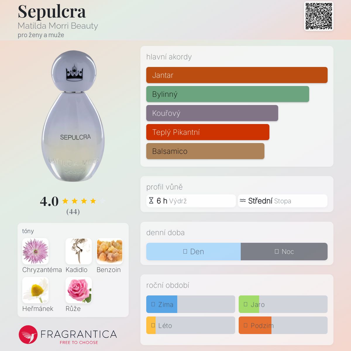 Sepulcra podle Matilda Morri Beauty je Woody vůně pro ženy a muže. Toto je nová vůně. Sepulcra byl/a uveden/a v roce 2024. "Nosem" za touto vůní je Lorenzo Volonté. Vrchní tóny jsou Heřmánek a Růže; střední tón jeChryzantéma ; základní tóny jsou Kadidlo a Benzoin.