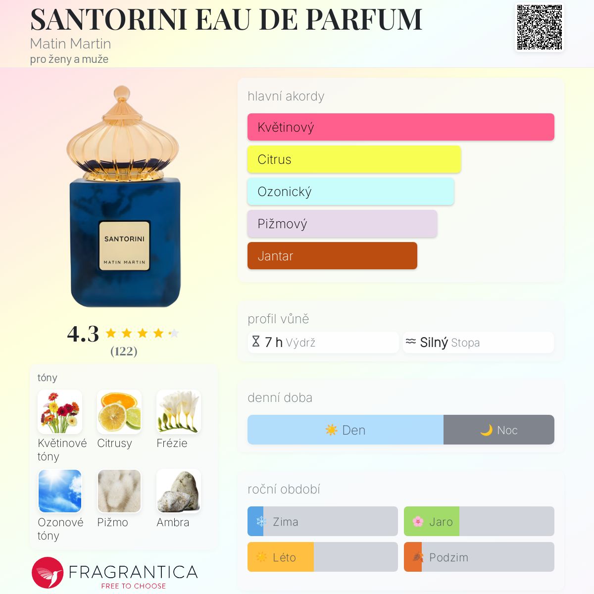 SANTORINI EAU DE PARFUM podle Matin Martin je Woody Spicy vůně pro ženy a muže. SANTORINI EAU DE PARFUM byl/a uveden/a v roce 2023. Vrchní tóny jsou Citrusy a Ozonové tóny; střední tóny jsouKvětinové tóny a Frézie ; základní tóny jsou Pižmo, Ambra a Mech.