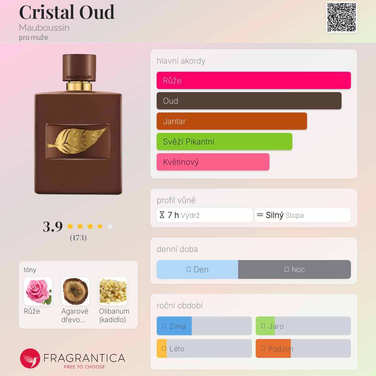 Cristal Oud podle Mauboussin je Orientální Woody vůně pro muže. Cristal Oud byl/a uveden/a v roce 2018. Vrchní tón je Růže ; střední tón jeOlibanum ; základní tón je Agarové dřevo (oud).