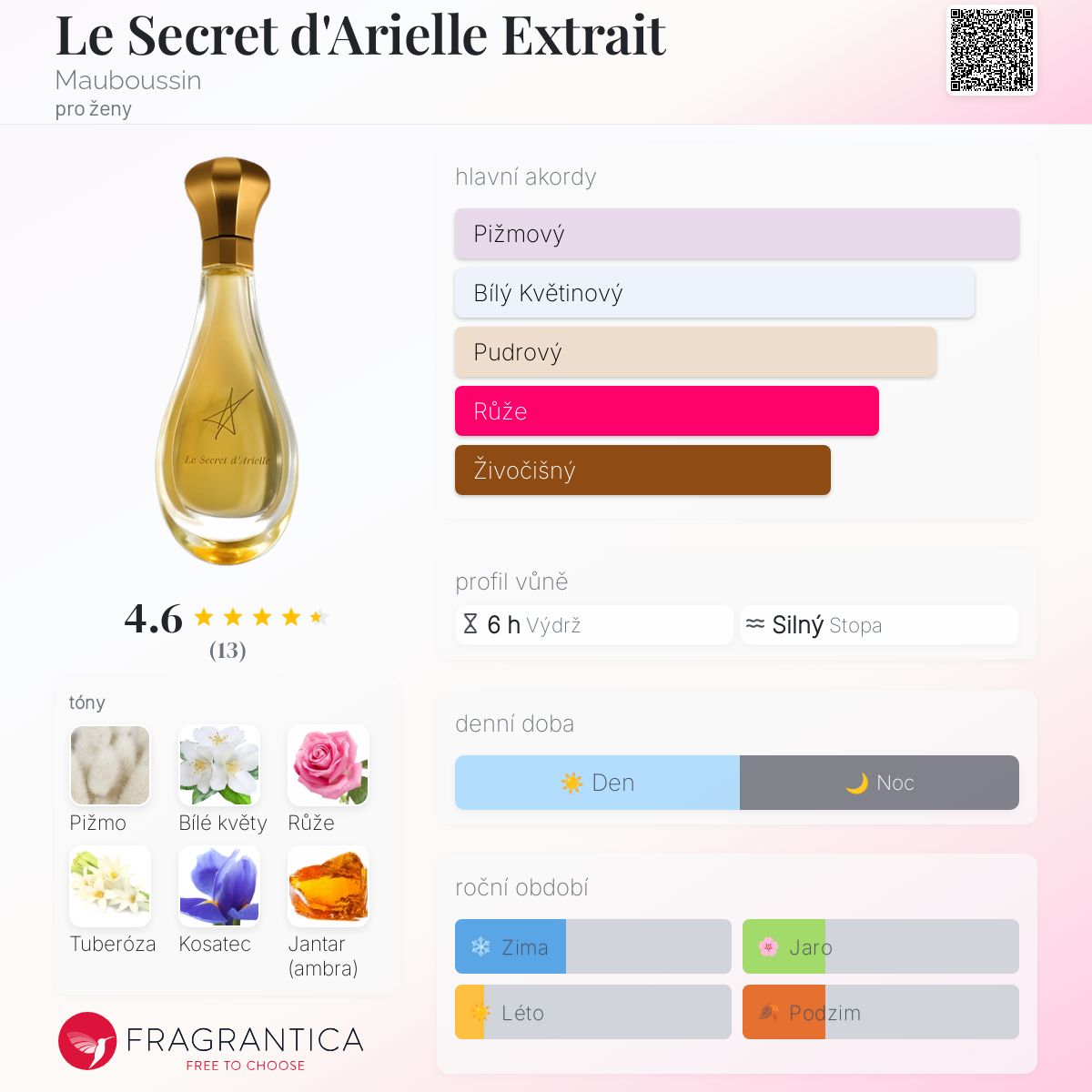 Le Secret d'Arielle Extrait podle Mauboussin je Floral vůně pro ženy. Le Secret d'Arielle Extrait byl/a uveden/a v roce 2015. Vrchní tóny jsou Bílé květy a Růžový pepř; střední tóny jsouRůže, Tuberóza a Kosatec ; základní tóny jsou Pižmo a Jantar (ambra).
