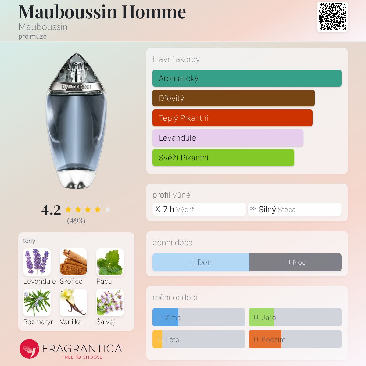Mauboussin Homme podle Mauboussin je Orientální Fougere vůně pro muže. Mauboussin Homme byl/a uveden/a v roce 2003. "Nosem" za touto vůní je Alberto Morillas. Vrchní tóny jsou Levandule, Rozmarýn a Bergamot; střední tóny jsouSkořice, Pačuli a Šalvěj ; základní tóny jsou Vanilka, Santalové dřevo a Pižmo.
