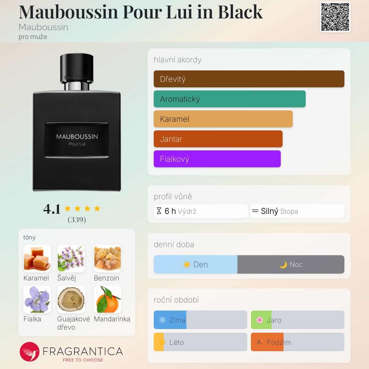 Mauboussin Pour Lui in Black podle Mauboussin je Orientální Woody vůně pro muže. Mauboussin Pour Lui in Black byl/a uveden/a v roce 2015. "Nosem" za touto vůní je Nathalie Feisthauer. Vrchní tóny jsou Karamel, Italská mandarinka a Máta; střední tóny jsouŠalvěj, Černá fialka a Virginský cedr ; základní tóny jsou Benzoin, Guajakové dřevo a List indonéského pačuli.