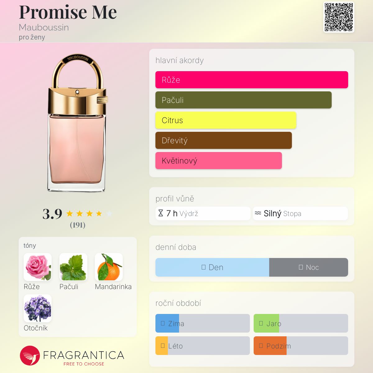 Promise Me podle Mauboussin je Floral vůně pro ženy. Promise Me byl/a uveden/a v roce 2015. "Nosem" za touto vůní je Karine Dubreuil-Sereni. Vrchní tón je Sicilská mandarinka ; střední tóny jsouRůže a Bílý heliotrop ; základní tón je Pačuli.