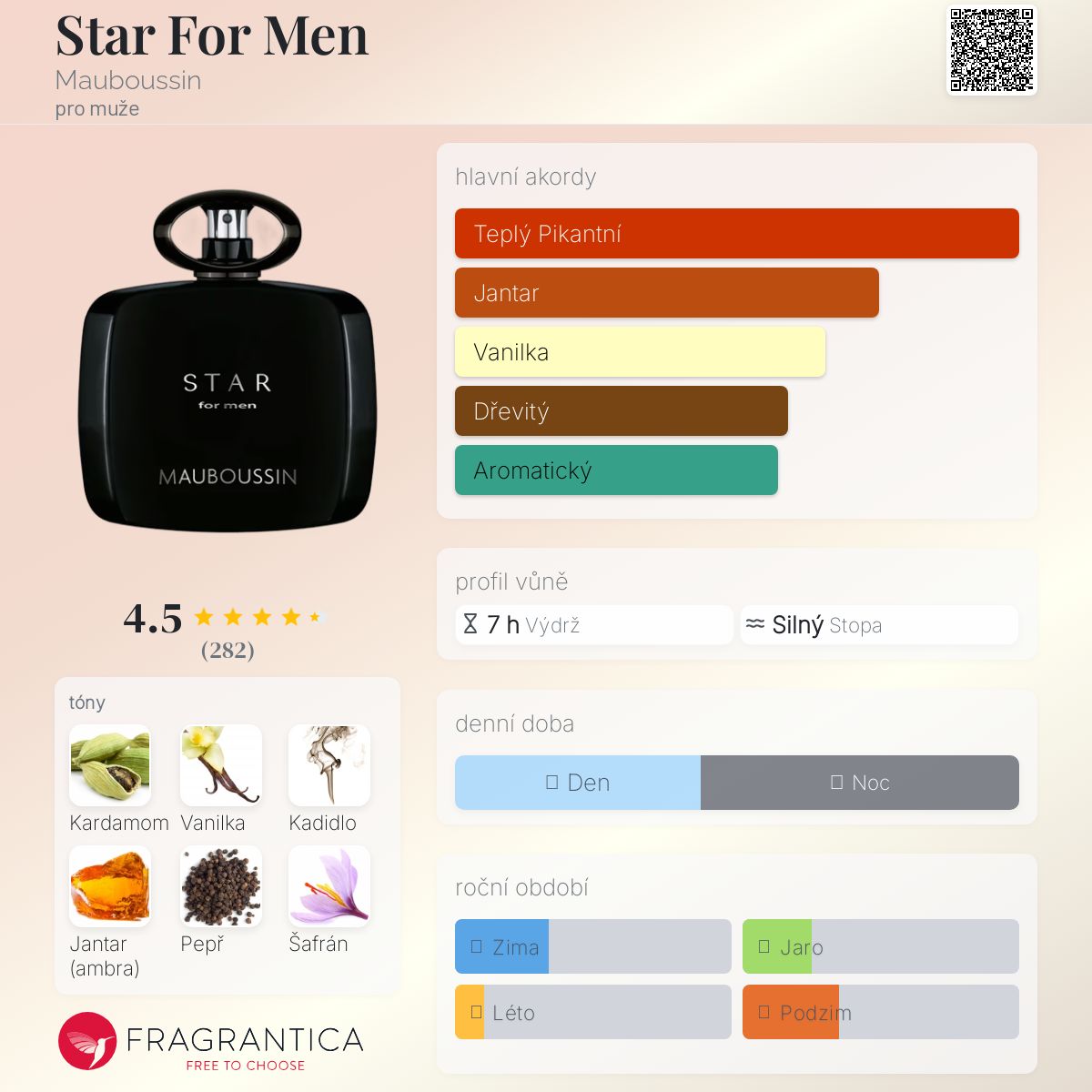 Star For Men podle Mauboussin je Orientální Woody vůně pro muže. Toto je nová vůně. Star For Men byl/a uveden/a v roce 2024. Vrchní tóny jsou Kardamom a Černý pepř; střední tóny jsouKadidlo a Šafrán ; základní tóny jsou Vanilka, Bílý jantar (ambra), Pačuli, Cedr a Kosatec.