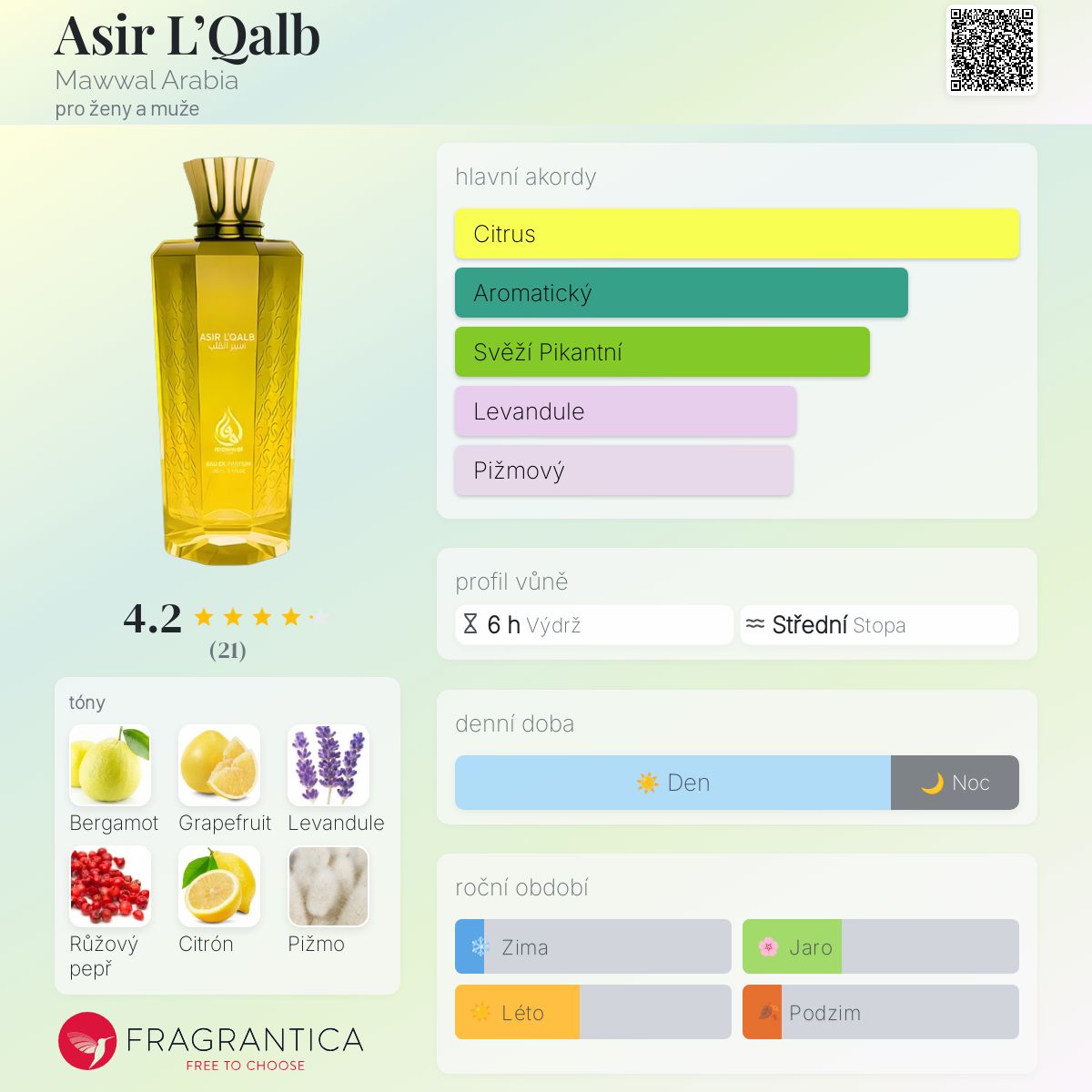 Asir L’Qalb podle Mawwal Arabia je Woody Aromatic vůně pro ženy a muže. Toto je nová vůně. Asir L’Qalb byl/a uveden/a v roce 2024. Vrchní tóny jsou Bergamot, Grapefruit, Růžový pepř a Sicilský citron; střední tóny jsouLevandule, Vetiver a Pelargónie ; základní tóny jsou Pižmo, Jantar (ambra) a Vanilka.
