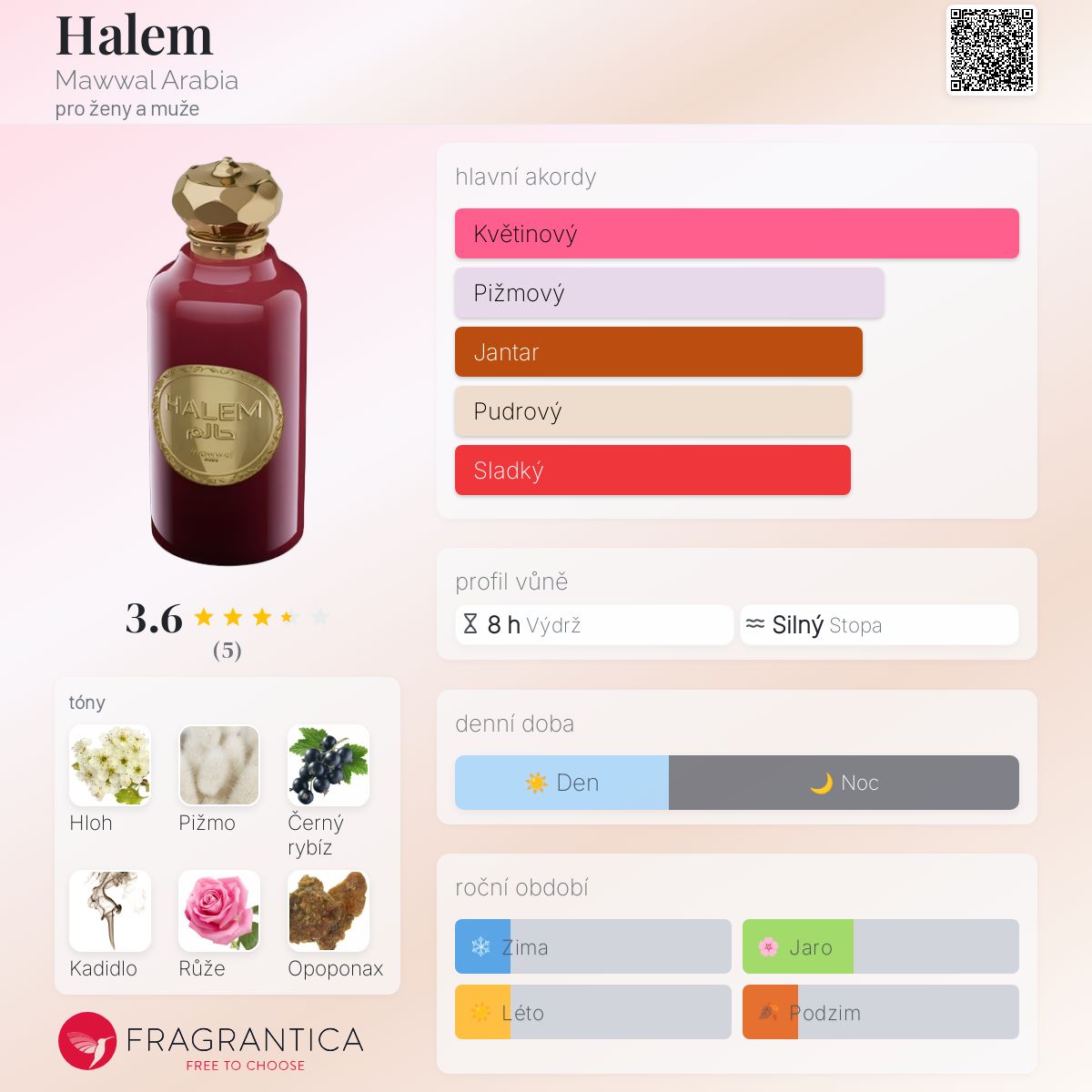 Halem podle Mawwal Arabia je Orientální Floral vůně pro ženy a muže. Toto je nová vůně. Halem byl/a uveden/a v roce 2024. Vrchní tóny jsou Hloh, Černý rybíz, Damašská růže a Mandarinka; střední tóny jsouOpoponax, Jasmín a Fialka ; základní tóny jsou Bílé pižmo, Kadidlo a Vanilka.