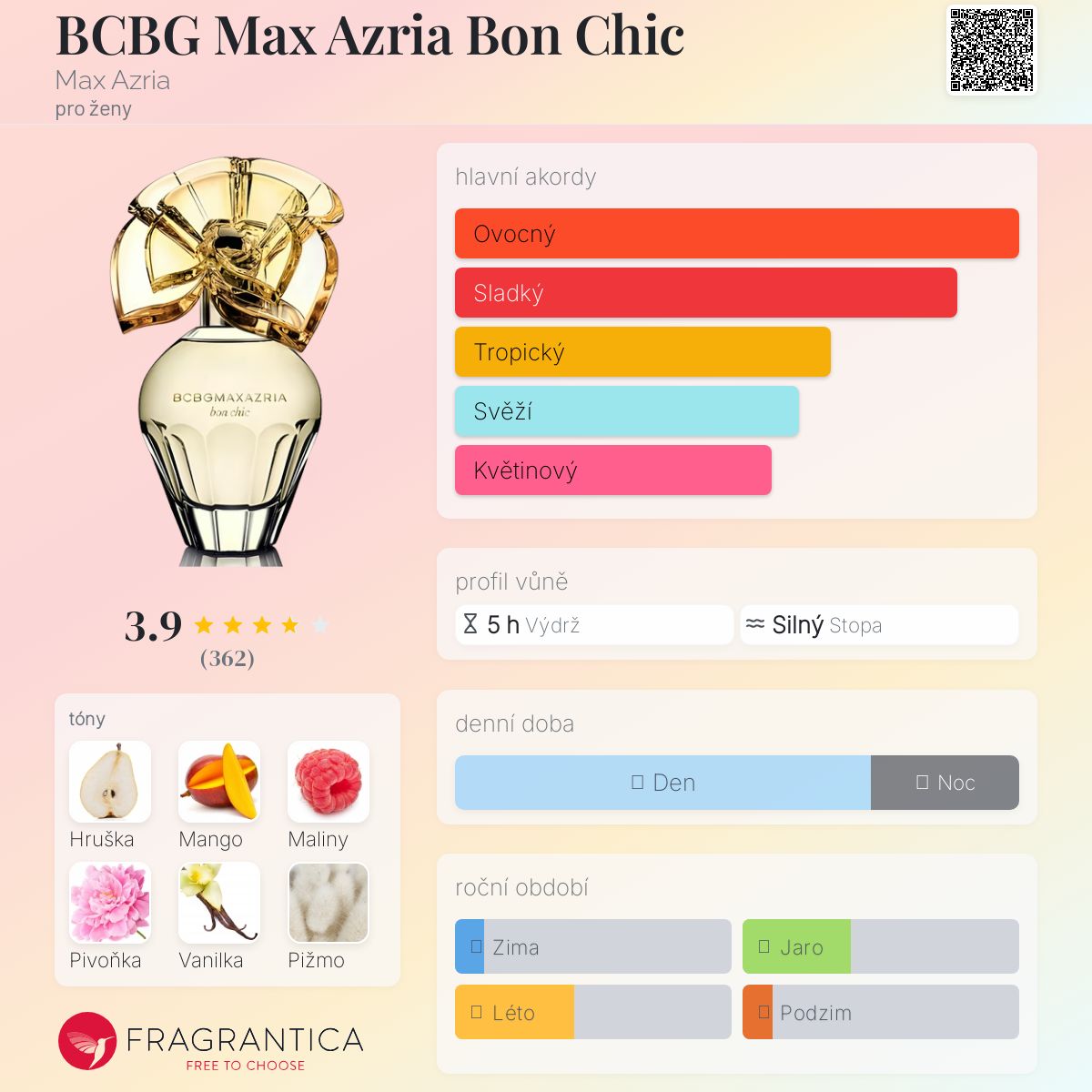 BCBG Max Azria Bon Chic podle Max Azria je Floral Fruity vůně pro ženy. BCBG Max Azria Bon Chic byl/a uveden/a v roce 2012. "Nosem" za touto vůní je Stephen Nilsen. Vrchní tóny jsou Hruška, Mango a Maliny; střední tóny jsouRůžová pivoňka, Pomerančový květ a Fialka ; základní tóny jsou Vanilka, Kašmírové pižmo a Dřevité tóny.