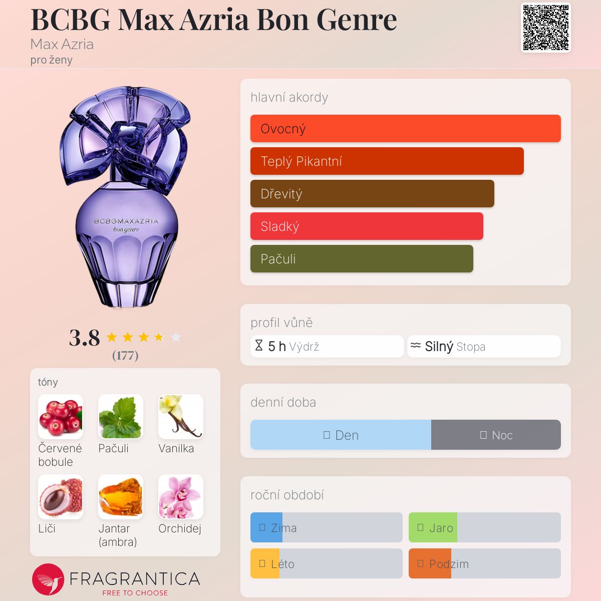 BCBG Max Azria Bon Genre podle Max Azria je Orientální Floral vůně pro ženy. BCBG Max Azria Bon Genre byl/a uveden/a v roce 2013. Vrchní tóny jsou Červené bobule, Liči, Černý pepř a Bergamot; střední tóny jsouOrchidej, Jasmín, Kardamom a Tuberóza ; základní tóny jsou Pačuli, Vanilka, Jantar (ambra) a Santalové dřevo.