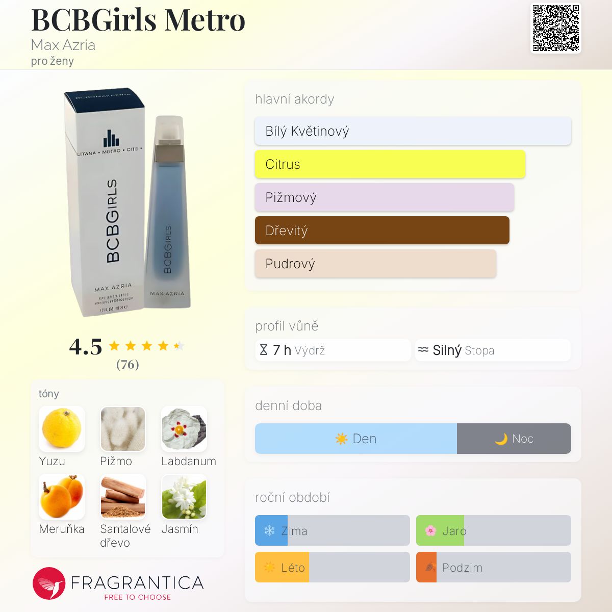 BCBGirls Metro podle Max Azria je Floral Fruity vůně pro ženy. BCBGirls Metro byl/a uveden/a v roce 2001.