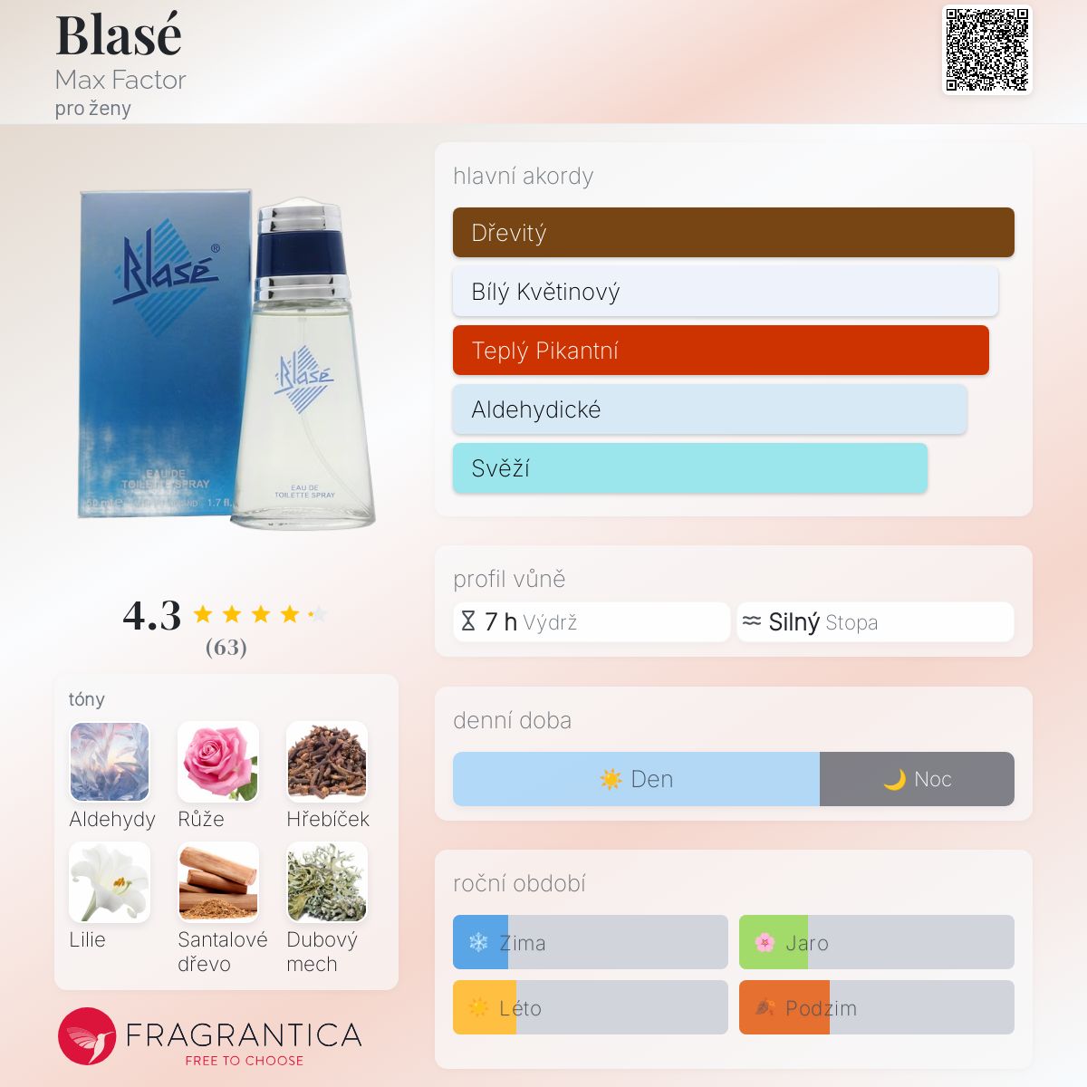 Blasé podle Max Factor je vůně pro ženy. Blasé byl/a uveden/a v roce 1975. "Nosem" za touto vůní je Jean-Louis Sieuzac. Vrchní tóny jsou Aldehydy, Červené bobule a Bergamot; střední tóny jsouRůže, Hřebíček, Lilie a Jasmín ; základní tóny jsou Santalové dřevo, Dubový mech, Jantar (ambra) a Cedr.