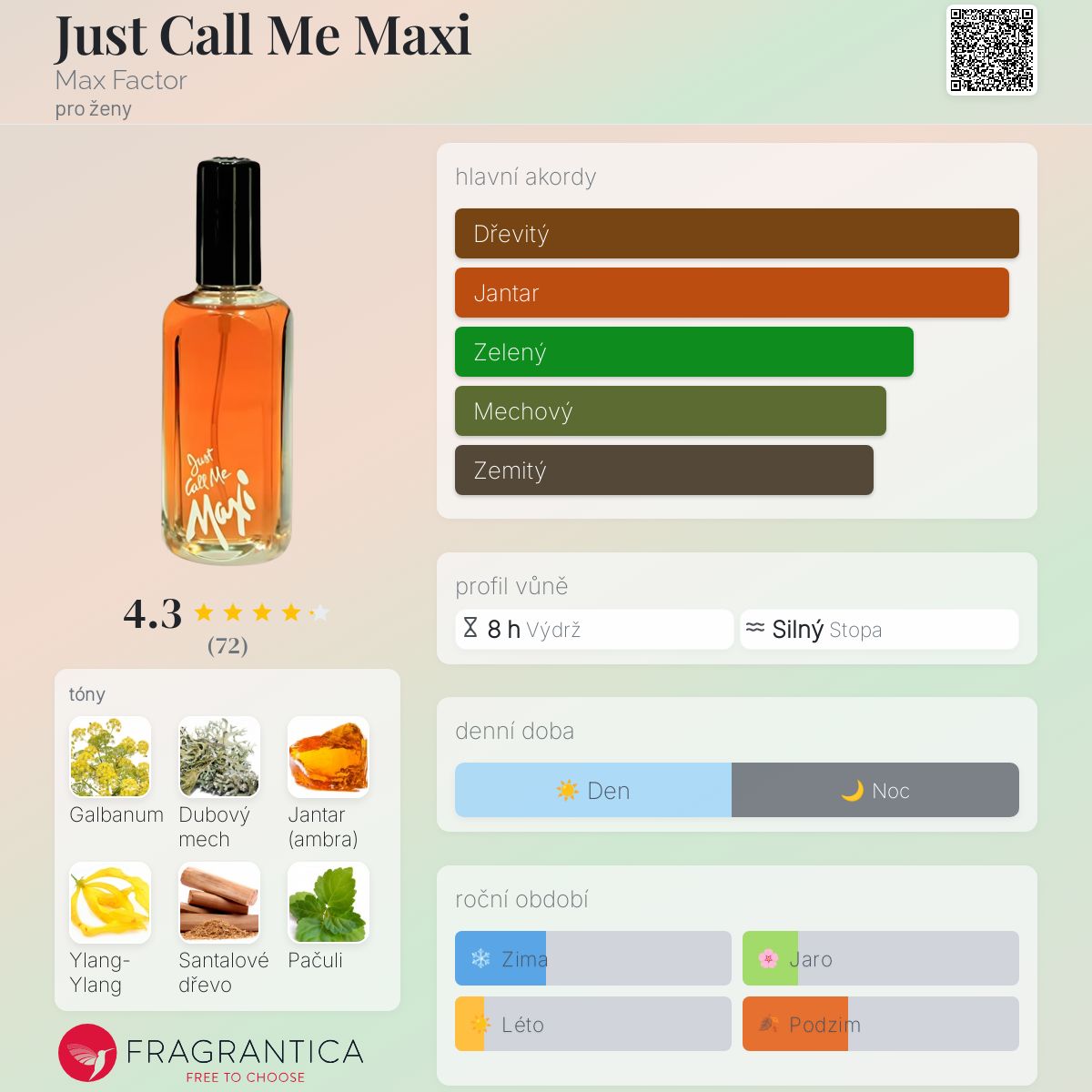 Just Call Me Maxi podle Max Factor je Orientální Floral vůně pro ženy. Just Call Me Maxi byl/a uveden/a v roce 1976. Vrchní tóny jsou Galbanum a Aldehydy; střední tóny jsouYlang-Ylang, Jasmín a Zimolez ; základní tóny jsou Dubový mech, Jantar (ambra), Santalové dřevo, Pačuli, Labdanum, Fazole tonka a Vanilka.
