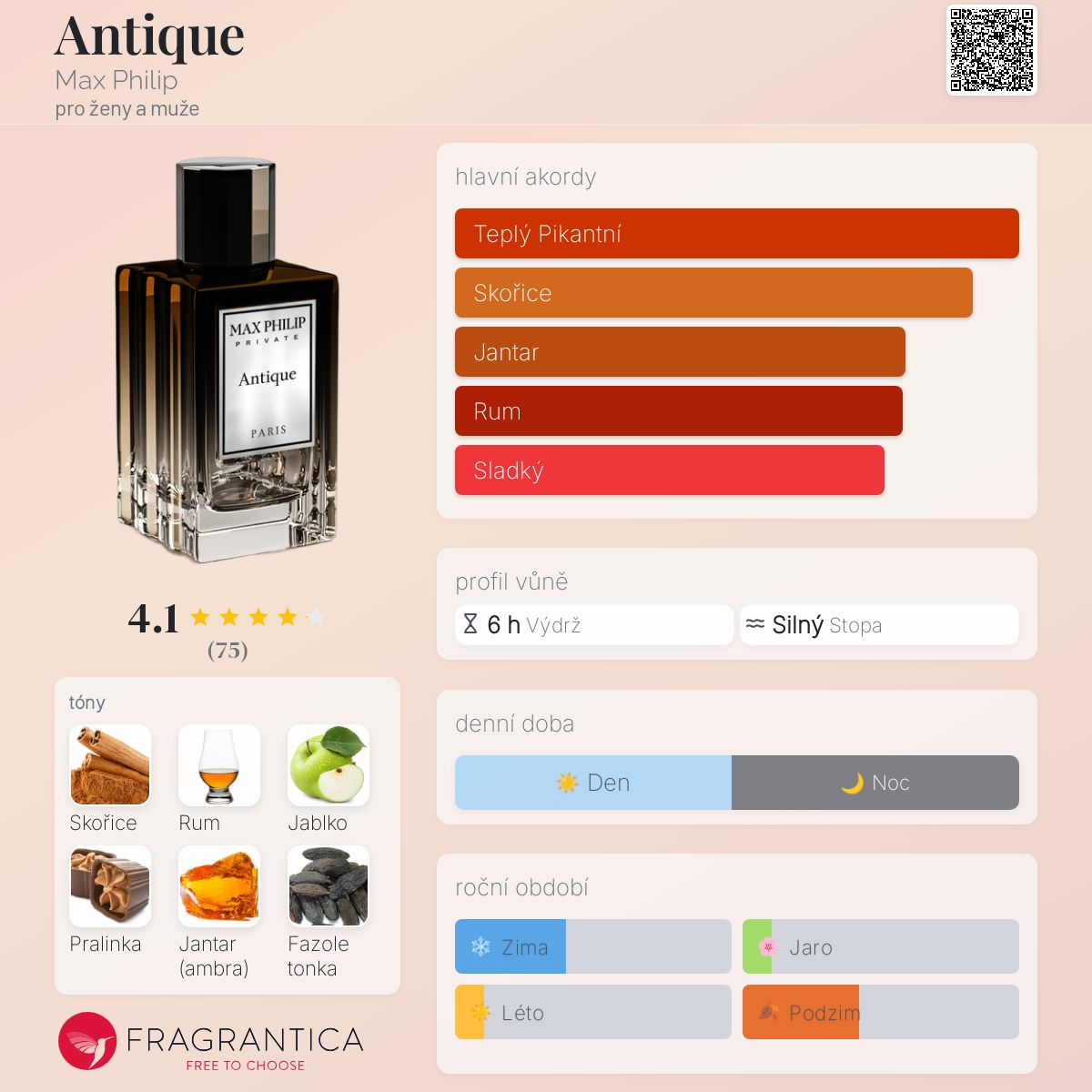 Antique podle Max Philip je Orientální Spicy vůně pro ženy a muže. Antique byl/a uveden/a v roce 2022. Vrchní tóny jsou Skořice, Rum a Jablko; střední tóny jsouSantalové dřevo, Labdanum a Kosatec ; základní tóny jsou Pralinka, Jantar (ambra), Fazole tonka a Mech.
