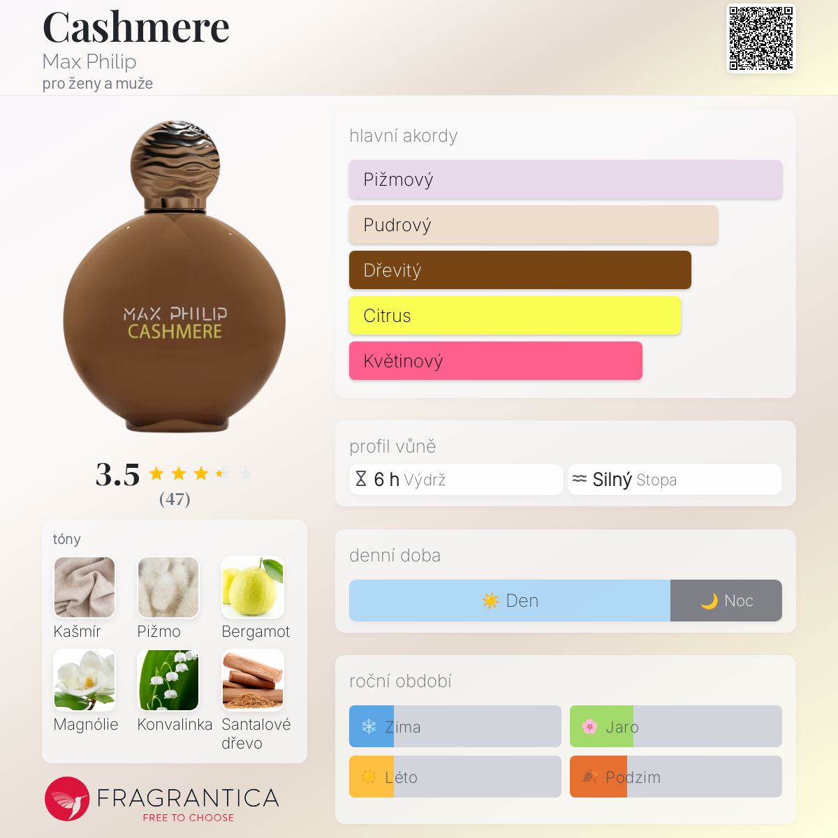 Cashmere podle Max Philip je Woody vůně pro ženy a muže. Toto je nová vůně. Cashmere byl/a uveden/a v roce 2024. Vrchní tóny jsou Bergamot, Krvavý pomeranč a Zázvor; střední tóny jsouKašmír, Magnólie a Konvalinka ; základní tóny jsou Pižmo, Santalové dřevo a Zvířecí tóny.