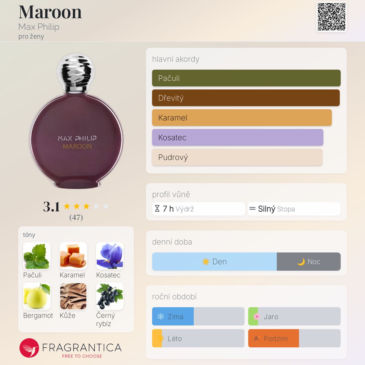 Maroon podle Max Philip je Chypre vůně pro ženy. Maroon byl/a uveden/a v roce 2019. Vrchní tóny jsou Bergamot a Černý rybíz; střední tóny jsouKosatec, Růže a Jasmín ; základní tóny jsou Pačuli, Karamel, Kůže a Bílé pižmo.