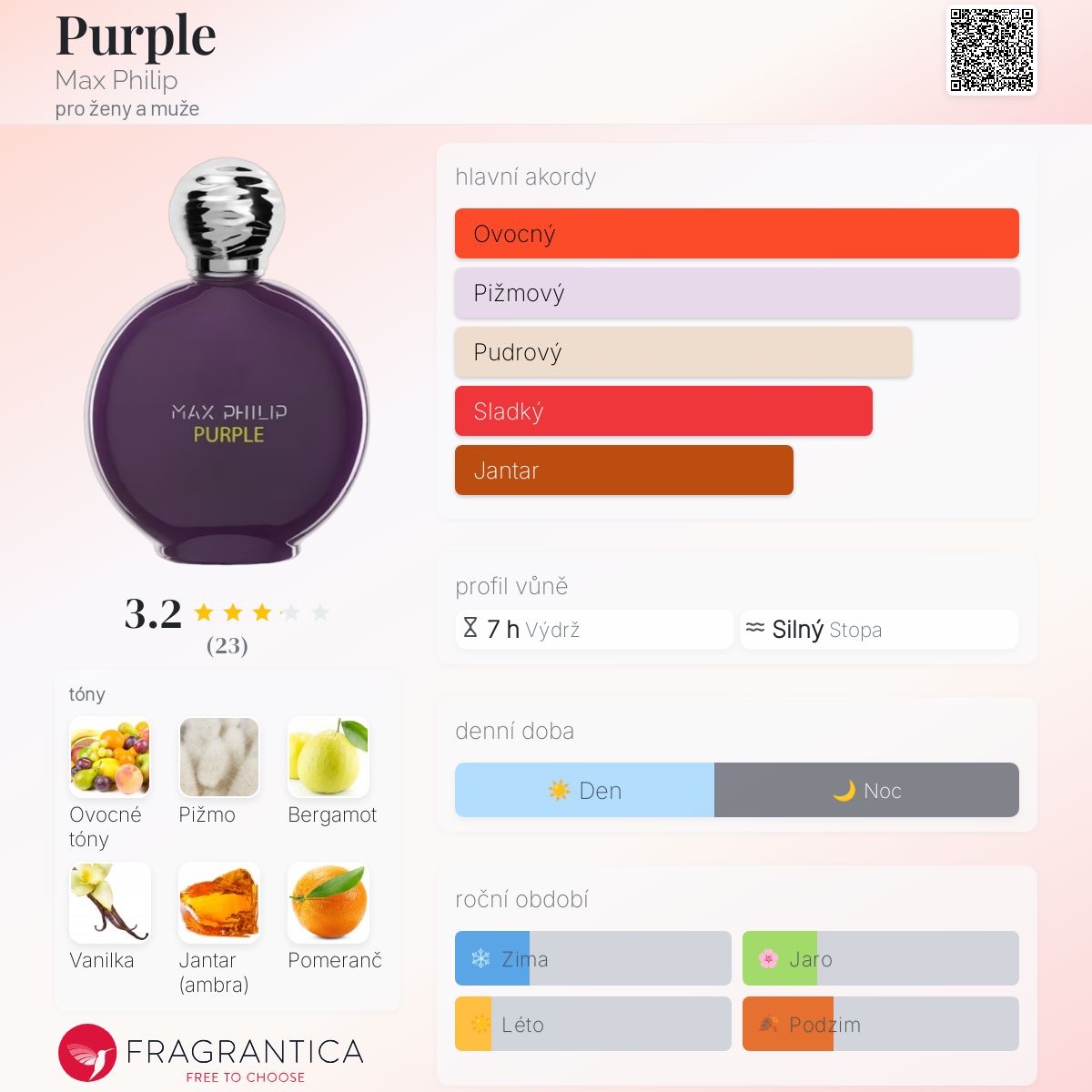 Purple podle Max Philip je Orientální vůně pro ženy a muže. Purple byl/a uveden/a v roce 2020. Vrchní tóny jsou Kalábrijský bergamot, Sicilský pomeranč a Sicilský citron; střední tón jeOvoce ; základní tóny jsou Bílé pižmo, Madagaskarská vanilka a Jantar (ambra).