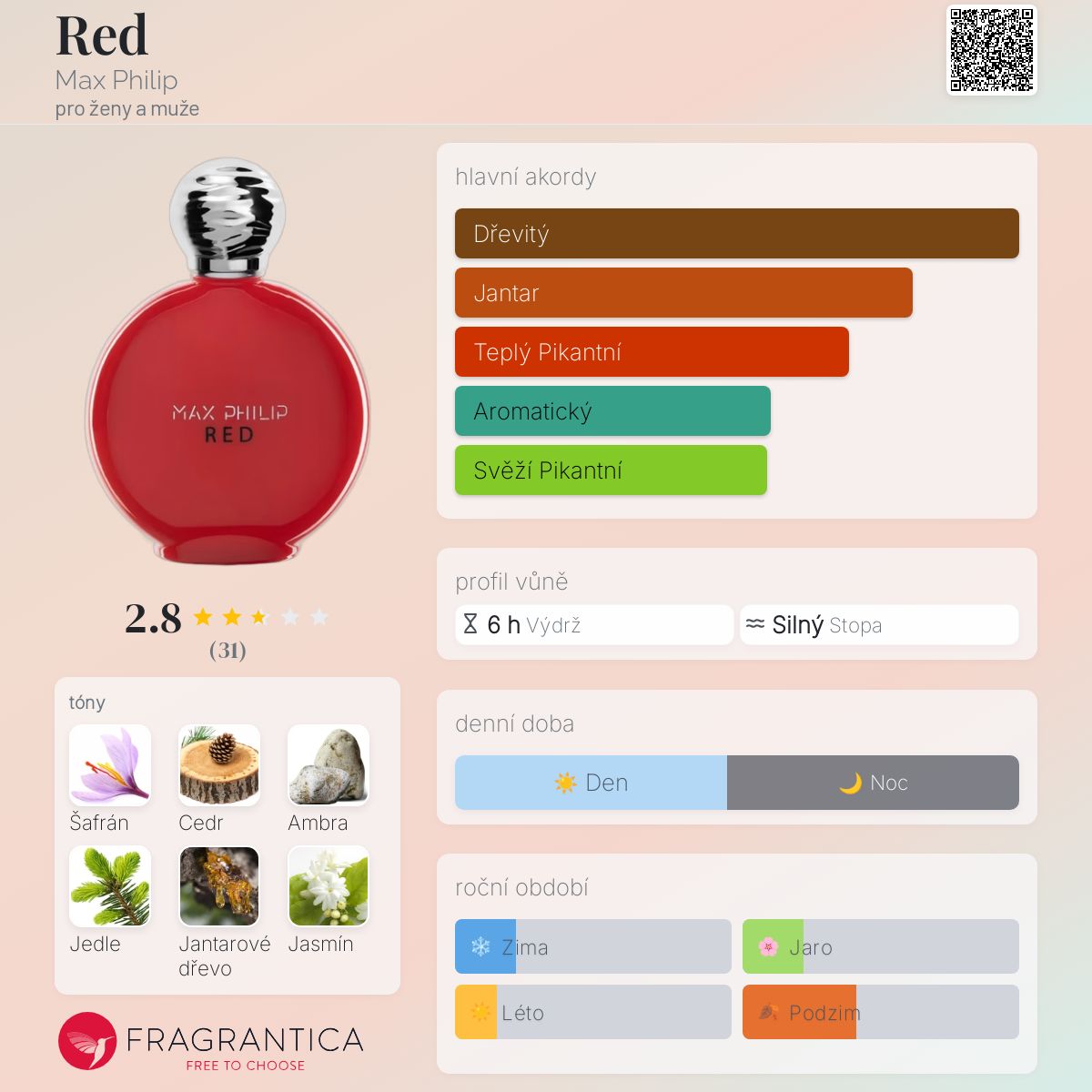 Red podle Max Philip je Orientální Floral vůně pro ženy a muže. Red byl/a uveden/a v roce 2020. Vrchní tóny jsou Šafrán a Jasmín; střední tóny jsouAmbra a Jantarové dřevo ; základní tóny jsou Cedr a Jedlová pryskyřice.