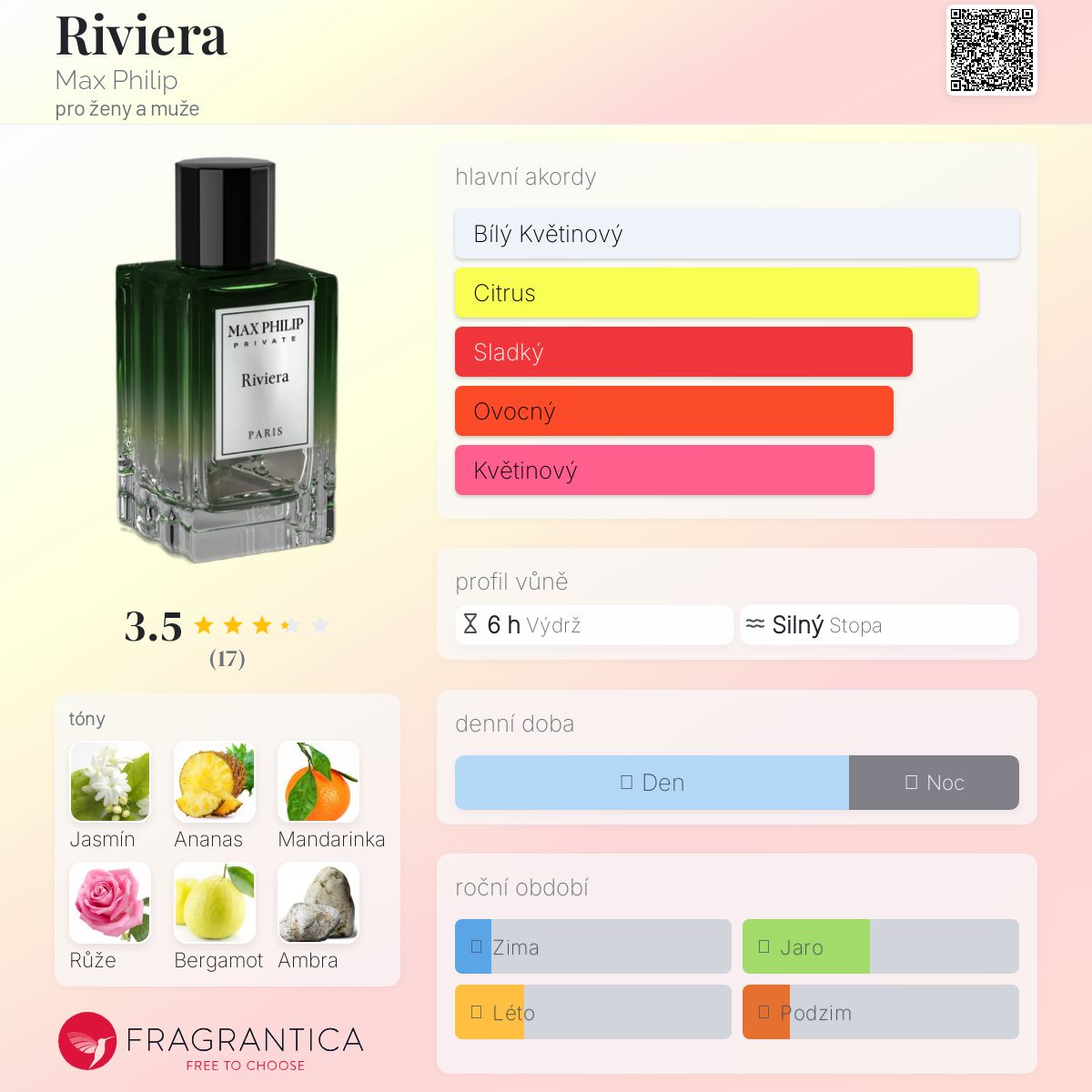 Riviera podle Max Philip je Chypre Fruity vůně pro ženy a muže. Toto je nová vůně. Riviera byl/a uveden/a v roce 2024. Vrchní tóny jsou Ananas, Mandarinka a Bergamot; střední tóny jsouJasmín Sambac a Růže ; základní tóny jsou Ambra, Vanilka a Orchidej.