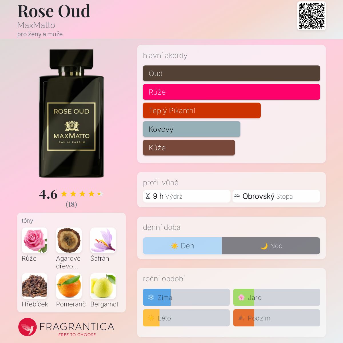 Rose Oud podle MaxMatto je Orientální Floral vůně pro ženy a muže. Rose Oud byl/a uveden/a v roce 2020. Vrchní tóny jsou Šafrán, Hřebíček, Pomeranč, Bergamot a Zelené tóny; střední tóny jsouRůže, Jasmín, Fialka, Cedr a Santalové dřevo ; základní tóny jsou Agarové dřevo (oud), Cypřiš, Pačuli, Guajakové dřevo a Bílé pižmo.