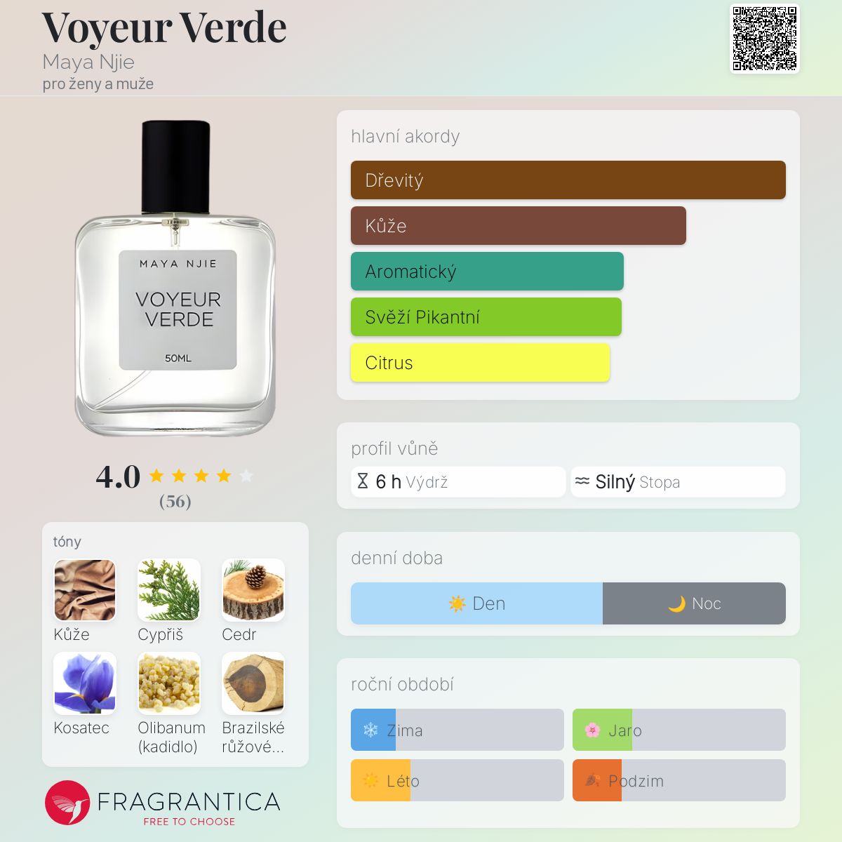 Voyeur Verde podle Maya Njie je Leather vůně pro ženy a muže. Voyeur Verde byl/a uveden/a v roce 2021. "Nosem" za touto vůní je Maya Njie. Vrchní tóny jsou Cypřiš, Bergamot a Mandarinka; střední tóny jsouKosatec, Brazilské růžové dřevo, Fenykl a Ylang-Ylang ; základní tóny jsou Kůže, Cedr, Olibanum a Pačuli.