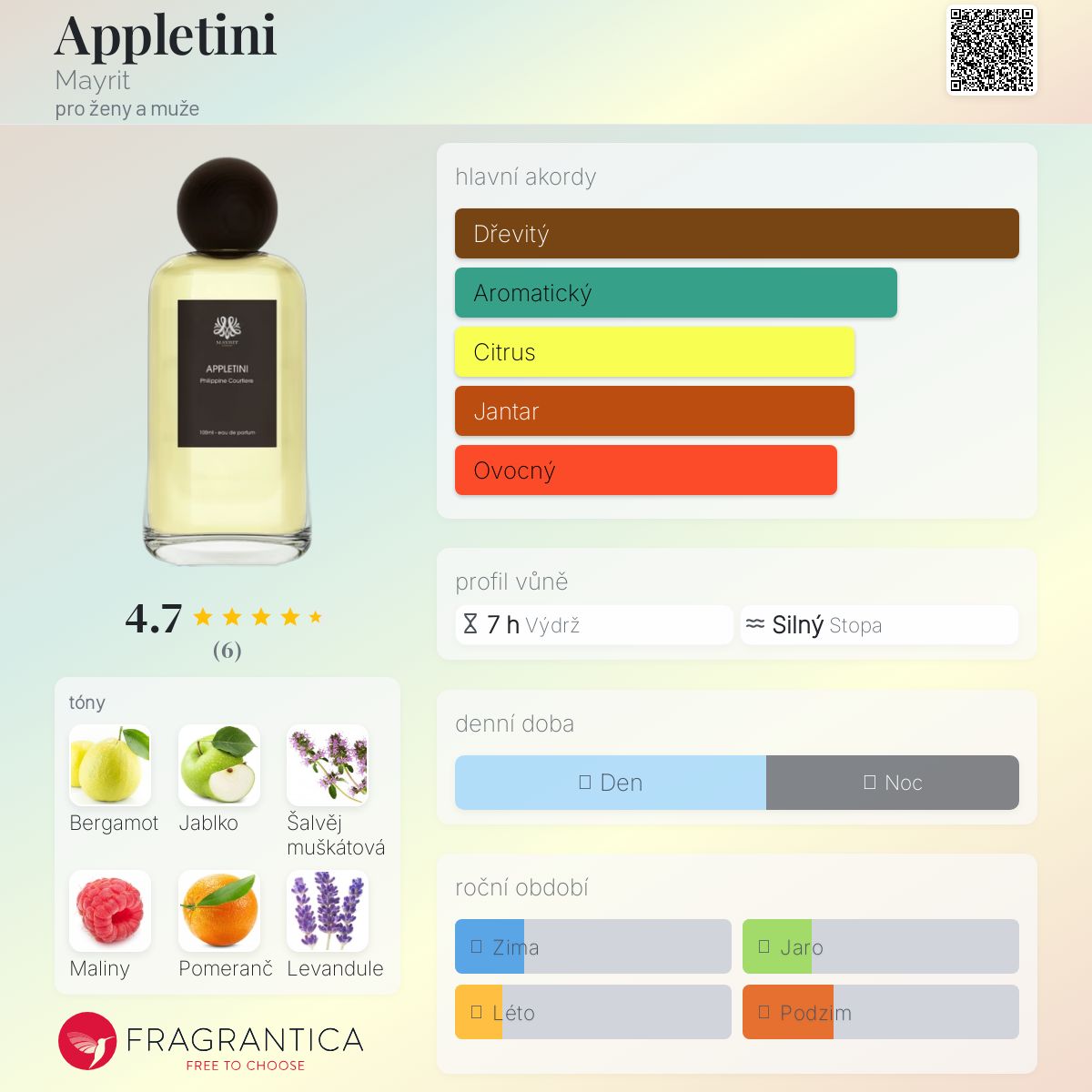 Appletini podle Mayrit je Orientální Floral vůně pro ženy a muže. Appletini byl/a uveden/a v roce 2023. "Nosem" za touto vůní je Philippine Courtière. Vrchní tóny jsou Bergamot, Jablko, Šalvěj muškátová, Maliny a Pomeranč; střední tóny jsouLevandule, Jasmín, Orris, Šafrán a Cedr ; základní tóny jsou Jantar (ambra), Santalové dřevo, Pačuli, Vetiver, Kůže a Labdanum.