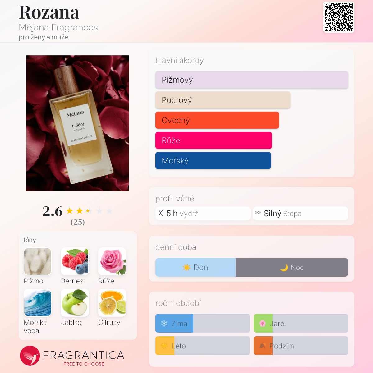 Rozana podle Méjana Fragrances je Floral Fruity vůně pro ženy a muže. Rozana byl/a uveden/a v roce 2023. "Nosem" za touto vůní je Qassem Abu Khalaf. Vrchní tóny jsou Berries, Jablko a Citrusy; střední tóny jsouRůže, Jasmín a Tuberóza ; základní tóny jsou Pižmo, Mořské tóny a Dubový mech.