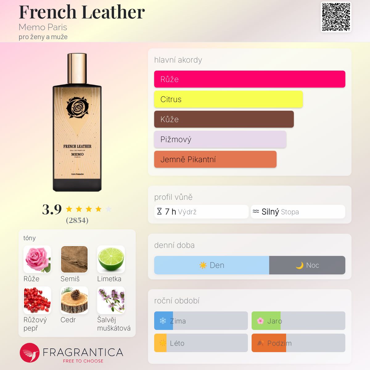 French Leather podle Memo Paris je Leather vůně pro ženy a muže. French Leather byl/a uveden/a v roce 2014. "Nosem" za touto vůní je Alienor Massenet. Vrchní tóny jsou Limetka, Růžový pepř, Jalovcové bobulky a Bergamot; střední tóny jsouRůže, Šalvěj muškátová a Seno ; základní tóny jsou Semiš a Cedr.